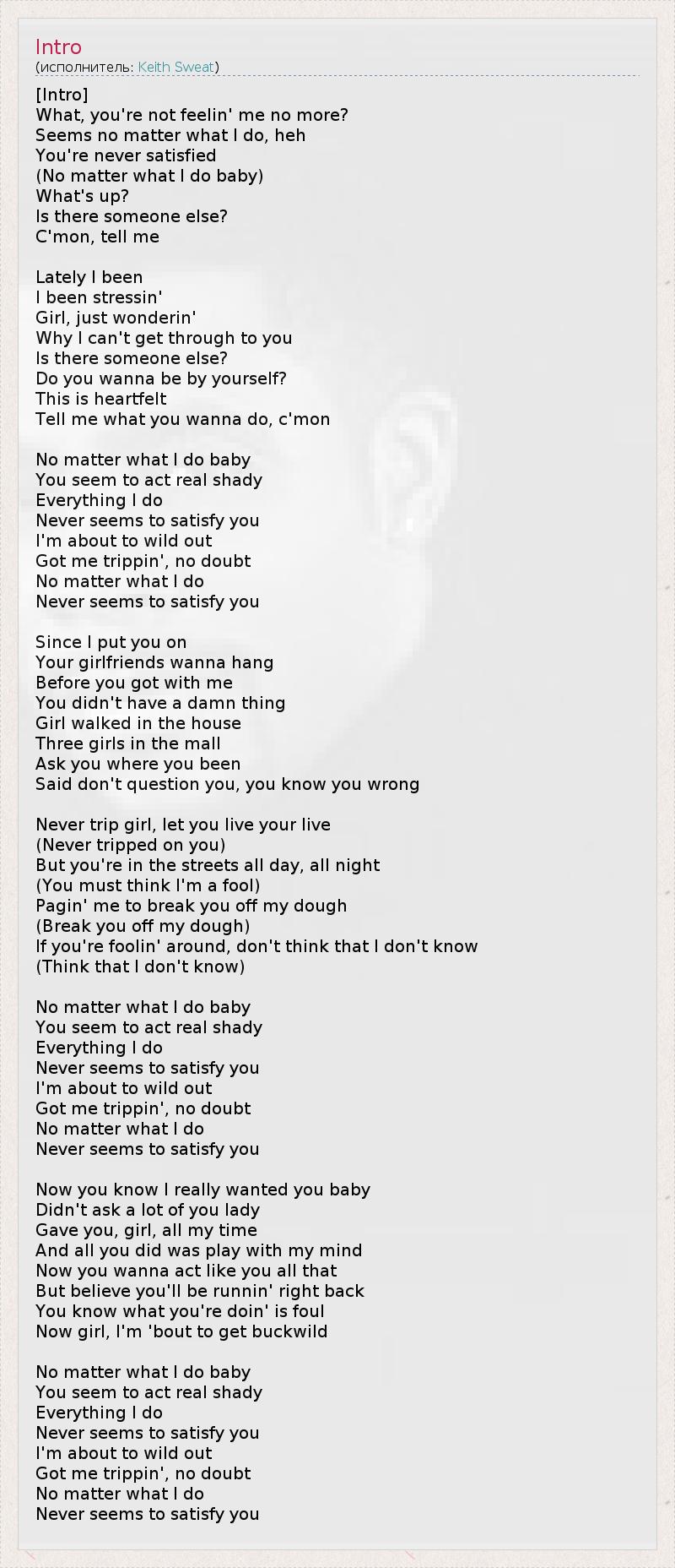 Это интересно:Keith Sweat (Keith Douglas Crier) популярный американский R&B певец. Родился 22 июля 1961 года в Нью-Йорке.Музыкальную карьеру начал в 1975 году в составе гарлемской группы Jamilah . Осенью 1987 года Keith выпускает дебютный альбом "Make It Last Forever". Вскоре пластинка стала трижды платиновой, а композиция "I Want Her" заняла первое место в R&B чартах.Затем, начиная с 1990 года по 2008 вышло ещё 8 альбомов. За это... продолжение