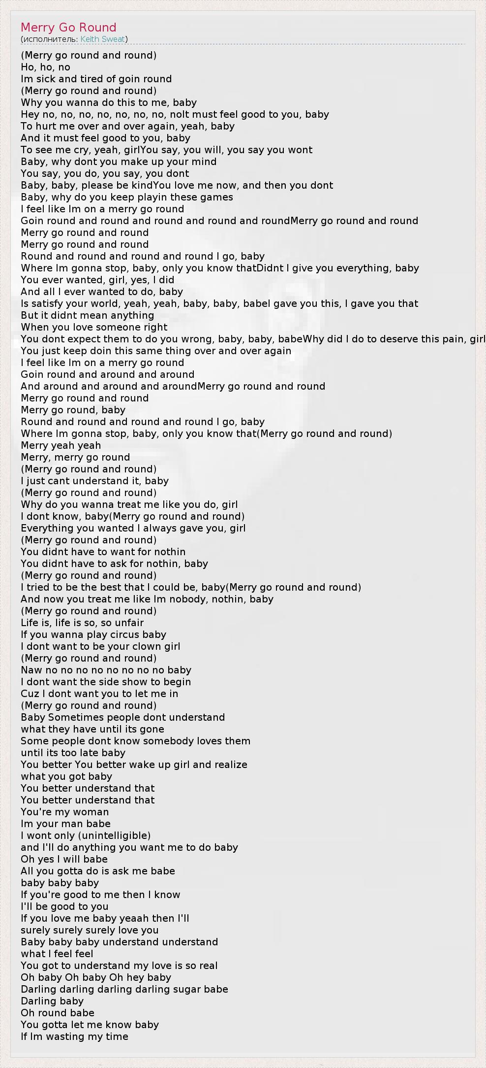 (Merry go round and round) Ho, ho, no Im sick and tired of goin round (Merry go round and round) Why you wanna do this to me, baby Hey no, no, no, no, no, no, no, noIt must feel good to you, baby To hurt me over and over again, yeah, baby And it must feel good to you, baby To see me cry, yeah, girlYou say, you will, you say you wont Baby, why dont you make up your mind You say, you do, you say, you dont Baby, baby, please be kindYou love me now, and then you dont Baby, why do you keep playin these games I feel like Im on a merry go round Goin round and round and round and round and roundMerry go round and round Merry go round and round Merry go round and round Round and round and round and round I go, baby Where Im gonna stop, baby, only you know thatDidnt I give you everything, baby You ever wanted, girl, yes, I did And all I ever wanted to do, baby Is satisfy your world, yeah, yeah, baby, baby, babeI gave you this, I gave you that But it didnt mean anything When you love someone right You dont expect them to do you wrong, baby, baby, babeWhy did I do to deserve this pain, girl You just keep doin this same thing over and over again I feel like Im on a merry go round Goin round and around and around And around and around and aroundMerry go round and round Merry go round and round Merry go round, baby Round and round and round and round I go, baby Where Im gonna stop, baby, only you know that(Merry go round and round) Merry yeah yeah Merry, merry go round (Merry go round and round) I just cant understand it, baby (Merry go round and round) Why do you wanna treat me like you do, girl I dont know, baby(Merry go round and round) Everything you wanted I always gave you, girl (Merry go round and round) You didnt have to want for nothin You didnt have to ask for nothin, baby (Merry go round and round) I tried to be the best that I could be, baby(Merry go round and round) And now you treat me like Im nobody, nothin, baby (Merry go round and round) Life is, life is so, so unfair If you wanna play circus baby I dont want to be your clown girl (Merry go round and round) Naw no no no no no no no no baby I dont want the side show to begin Cuz I dont want you to let me in (Merry go round and round) Baby Sometimes people dont understand what they have until its gone Some people dont know somebody loves them until its too late baby You better You better wake up girl and realize what you got baby You better understand that You better understand that You're my woman Im your man babe I wont only (unintelligible) and I'll do anything you want me to do baby Oh yes I will babe All you gotta do is ask me babe baby baby baby If you're good to me then I know I'll be good to you If you love me baby yeaah then I'll surely surely surely love you Baby baby baby understand understand what I feel feel You got to understand my love is so real Oh baby Oh baby Oh hey baby Darling darling darling darling sugar babe Darling baby Oh round babe You gotta let me know baby If Im wasting my time