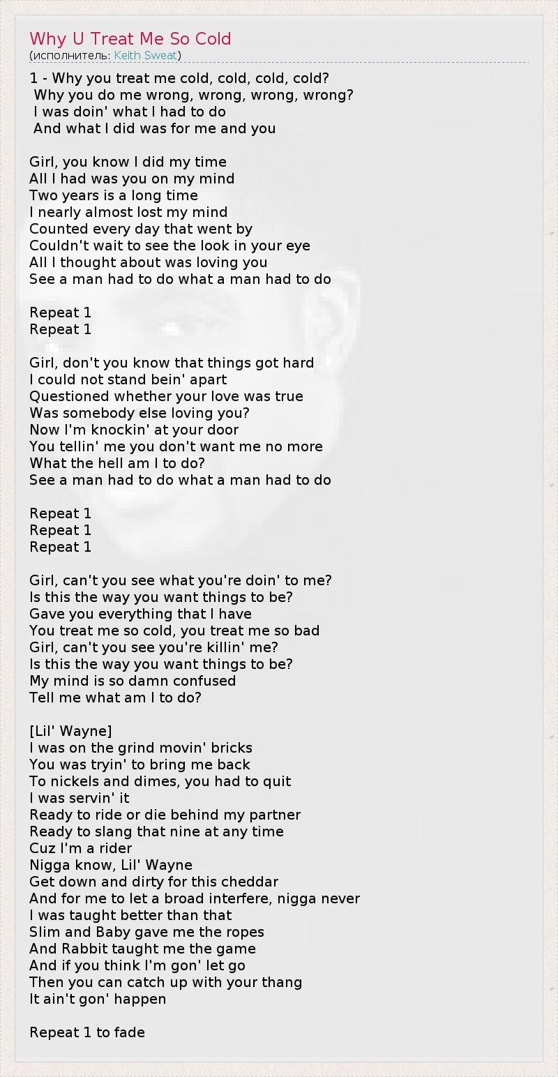 1 - Why you treat me cold, cold, cold, cold? Why you do me wrong, wrong, wrong, wrong? I was doin' what I had to do And what I did was for me and you Girl, you know I did my time All I had was you on my mind Two years is a long time I nearly almost lost my mind Counted every day that went by Couldn't wait to see the look in your eye All I thought about was loving you See a man had to do what a man had to do Repeat 1 Repeat 1 Girl, don't you know that things got hard I could not stand bein' apart Questioned whether your love was true Was somebody else loving you? Now I'm knockin' at your door You tellin' me you don't want me no more What the hell am I to do? See a man had to do what a man had to do Repeat 1 Repeat 1 Repeat 1 Girl, can't you see what you're doin' to me? Is this the way you want things to be? Gave you everything that I have You treat me so cold, you treat me so bad Girl, can't you see you're killin' me? Is this the way you want things to be? My mind is so damn confused Tell me what am I to do? [Lil' Wayne] I was on the grind movin' bricks You was tryin' to bring me back To nickels and dimes, you had to quit I was servin' it Ready to ride or die behind my partner Ready to slang that nine at any time Cuz I'm a rider Nigga know, Lil' Wayne Get down and dirty for this cheddar And for me to let a broad interfere, nigga never I was taught better than that Slim and Baby gave me the ropes And Rabbit taught me the game And if you think I'm gon' let go Then you can catch up with your thang It ain't gon' happen Repeat 1 to fade