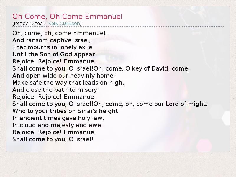 Oh, come, oh, come Emmanuel, And ransom captive Israel, That mourns in lonely exile Until the Son of God appear. Rejoice! Rejoice! Emmanuel Shall come to you, O Israel!Oh, come, O key of David, come, And open wide our heav'nly home; Make safe the way that leads on high, And close the path to misery. Rejoice! Rejoice! Emmanuel Shall come to you, O Israel!Oh, come, oh, come our Lord of might, Who to your tribes on Sinai's height In ancient times gave holy law, In cloud and majesty and awe Rejoice! Rejoice! Emmanuel Shall come to you, O Israel!