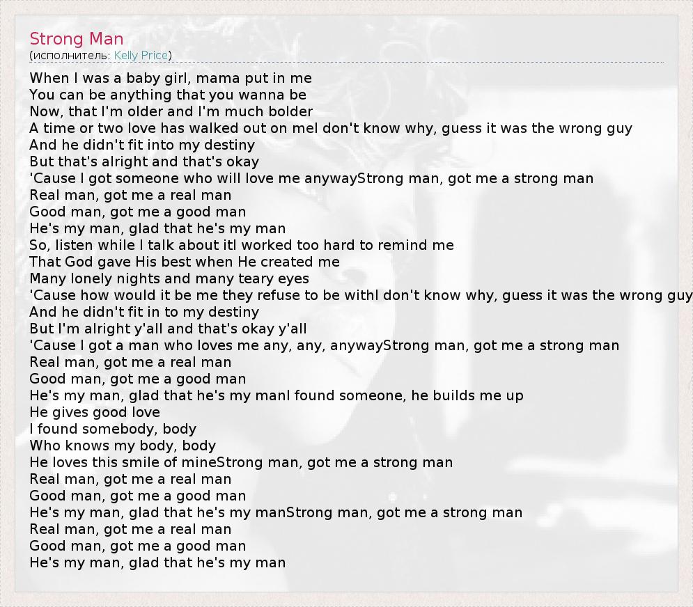'Cause I got someone who will love me anywayStrong man, got me a strong man