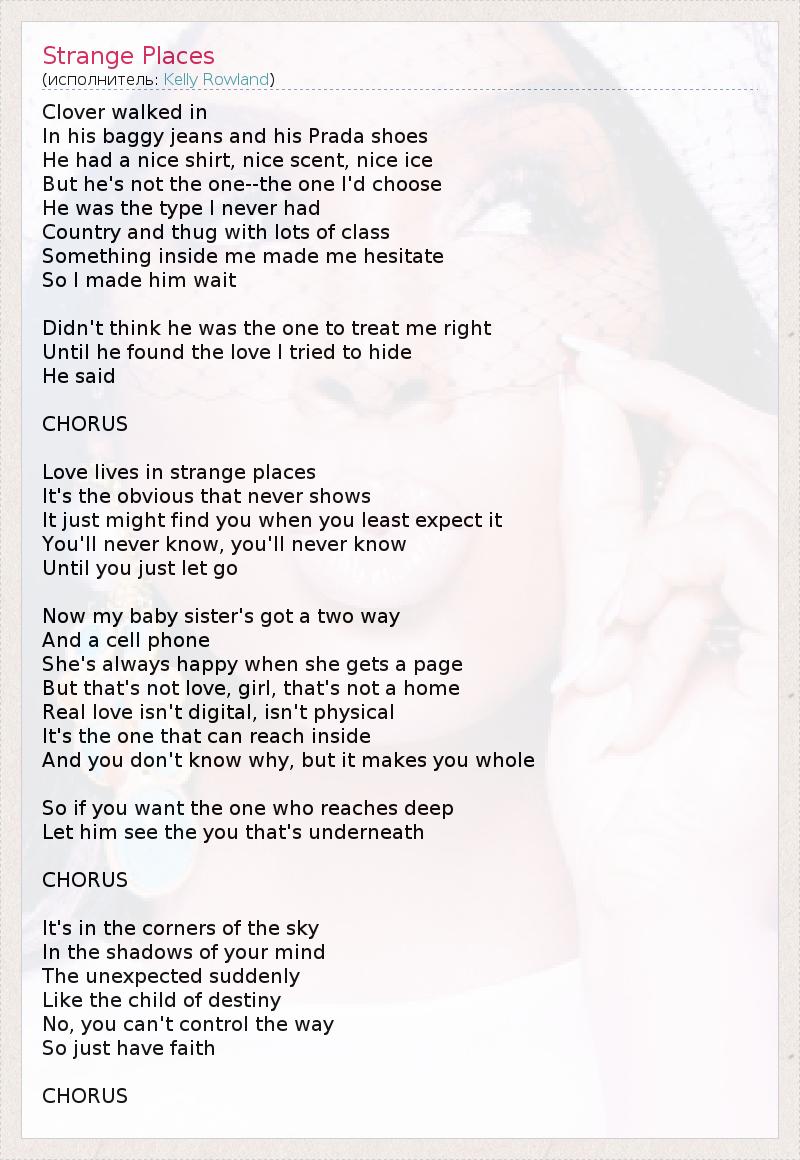 Clover walked in In his baggy jeans and his Prada shoes He had a nice shirt, nice scent, nice ice But he's not the one--the one I'd choose He was the type I never had Country and thug with lots of class Something inside me made me hesitate So I made him wait Didn't think he was the one to treat me right Until he found the love I tried to hide He said CHORUS Love lives in strange places It's the obvious that never shows It just might find you when you least expect it You'll never know, you'll never know Until you just let go Now my baby sister's got a two way And a cell phone She's always happy when she gets a page But that's not love, girl, that's not a home Real love isn't digital, isn't physical It's the one that can reach inside And you don't know why, but it makes you whole So if you want the one who reaches deep Let him see the you that's underneath CHORUS It's in the corners of the sky In the shadows of your mind The unexpected suddenly Like the child of destiny No, you can't control the way So just have faith CHORUS