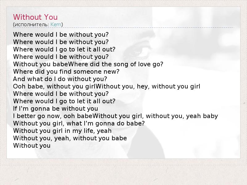 Where would I be without you? Where would I be without you? Where would I go to let it all out? Where would I be without you? Without you babeWhere did the song of love go? Where did you find someone new? And what do I do without you? Ooh babe, without you girlWithout you, hey, without you girl Where would I be without you? Where would I go to let it all out? If I'm gonna be without you I better go now, ooh babeWithout you girl, without you, yeah baby Without you girl, what I'm gonna do babe? Without you girl in my life, yeah Without you, yeah, without you babe Without you