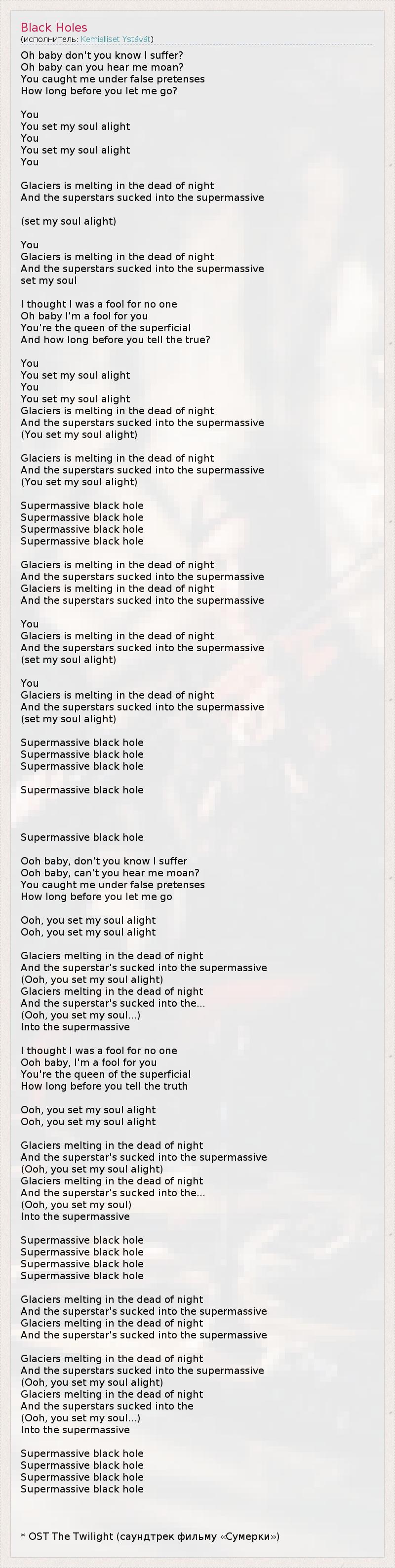 Oh baby don't you know I suffer? Oh baby can you hear me moan? You caught me under false pretenses How long before you let me go? You You set my soul alight You You set my soul alight You Glaciers is melting in the dead of night And the superstars sucked into the supermassive (set my soul alight) You Glaciers is melting in the dead of night And the superstars sucked into the supermassive set my soul I thought I was a fool for no one Oh baby I'm a fool for you You're the queen of the superficial And how long before you tell the true? You You set my soul alight You You set my soul alight Glaciers is melting in the dead of night And the superstars sucked into the supermassive (You set my soul alight) Glaciers is melting in the dead of night And the superstars sucked into the supermassive (You set my soul alight) Supermassive black hole Supermassive black hole Supermassive black hole Supermassive black hole Glaciers is melting in the dead of night And the superstars sucked into the supermassive Glaciers is melting in the dead of night And the superstars sucked into the supermassive You Glaciers is melting in the dead of night And the superstars sucked into the supermassive (set my soul alight) You Glaciers is melting in the dead of night And the superstars sucked into the supermassive (set my soul alight) Supermassive black hole Supermassive black hole Supermassive black hole Supermassive black hole Supermassive black hole Ooh baby, don't you know I suffer Ooh baby, can't you hear me moan? You caught me under false pretenses How long before you let me go Ooh, you set my soul alight Ooh, you set my soul alight Glaciers melting in the dead of night And the superstar's sucked into the supermassive (Ooh, you set my soul alight) Glaciers melting in the dead of night And the superstar's sucked into the... (Ooh, you set my soul...) Into the supermassive I thought I was a fool for no one Ooh baby, I'm a fool for you You're the queen of the superficial How long before you tell the truth Ooh, you set my soul alight Ooh, you set my soul alight Glaciers melting in the dead of night And the superstar's sucked into the supermassive (Ooh, you set my soul alight) Glaciers melting in the dead of night And the superstar's sucked into the... (Ooh, you set my soul) Into the supermassive Supermassive black hole Supermassive black hole Supermassive black hole Supermassive black hole Glaciers melting in the dead of night And the superstar's sucked into the supermassive Glaciers melting in the dead of night And the superstar's sucked into the supermassive Glaciers melting in the dead of night And the superstars sucked into the supermassive (Ooh, you set my soul alight) Glaciers melting in the dead of night And the superstars sucked into the (Ooh, you set my soul...) Into the supermassive Supermassive black hole Supermassive black hole Supermassive black hole Supermassive black hole * OST The Twilight (саундтрек фильму «Сумерки»)