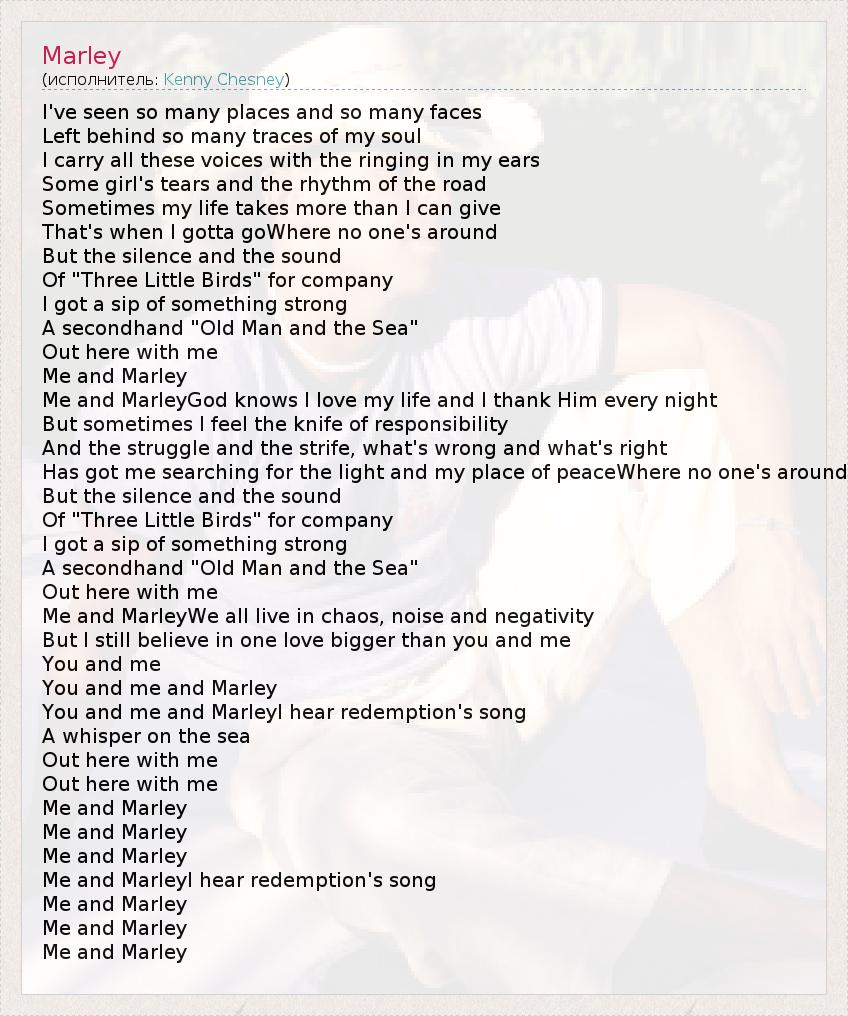 I've seen so many places and so many faces Left behind so many traces of my soul I carry all these voices with the ringing in my ears Some girl's tears and the rhythm of the road Sometimes my life takes more than I can give That's when I gotta goWhere no one's around But the silence and the sound Of "Three Little Birds" for company I got a sip of something strong A secondhand "Old Man and the Sea" Out here with me Me and Marley Me and MarleyGod knows I love my life and I thank Him every night But sometimes I feel the knife of responsibility And the struggle and the strife, what's wrong and what's right Has got me searching for the light and my place of peaceWhere no one's around But the silence and the sound Of "Three Little Birds" for company I got a sip of something strong A secondhand "Old Man and the Sea" Out here with me Me and MarleyWe all live in chaos, noise and negativity But I still believe in one love bigger than you and me You and me You and me and Marley You and me and MarleyI hear redemption's song A whisper on the sea Out here with me Out here with me Me and Marley Me and Marley Me and Marley Me and MarleyI hear redemption's song Me and Marley Me and Marley Me and Marley