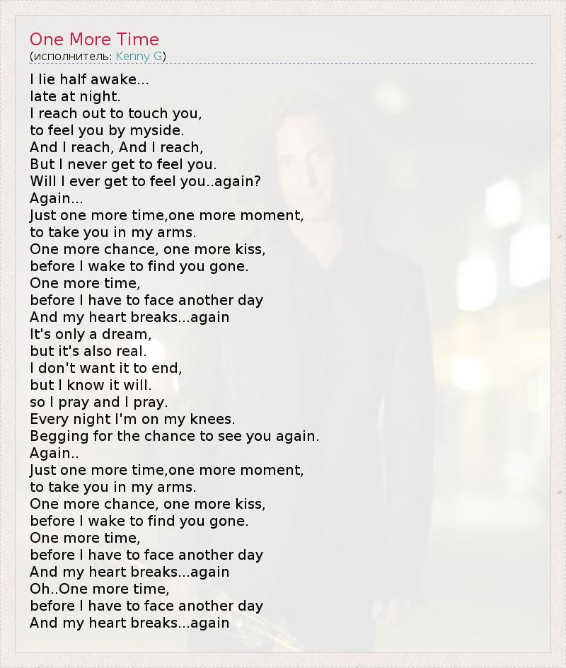 I lie half awake... late at night. I reach out to touch you, to feel you by myside. And I reach, And I reach, But I never get to feel you. Will I ever get to feel you..again? Again... Just one more time,one more moment, to take you in my arms. One more chance, one more kiss, before I wake to find you gone. One more time, before I have to face another day And my heart breaks...again It's only a dream, but it's also real. I don't want it to end, but I know it will. so I pray and I pray. Every night I'm on my knees. Begging for the chance to see you again. Again.. Just one more time,one more moment, to take you in my arms. One more chance, one more kiss, before I wake to find you gone. One more time, before I have to face another day And my heart breaks...again Oh..One more time, before I have to face another day And my heart breaks...again