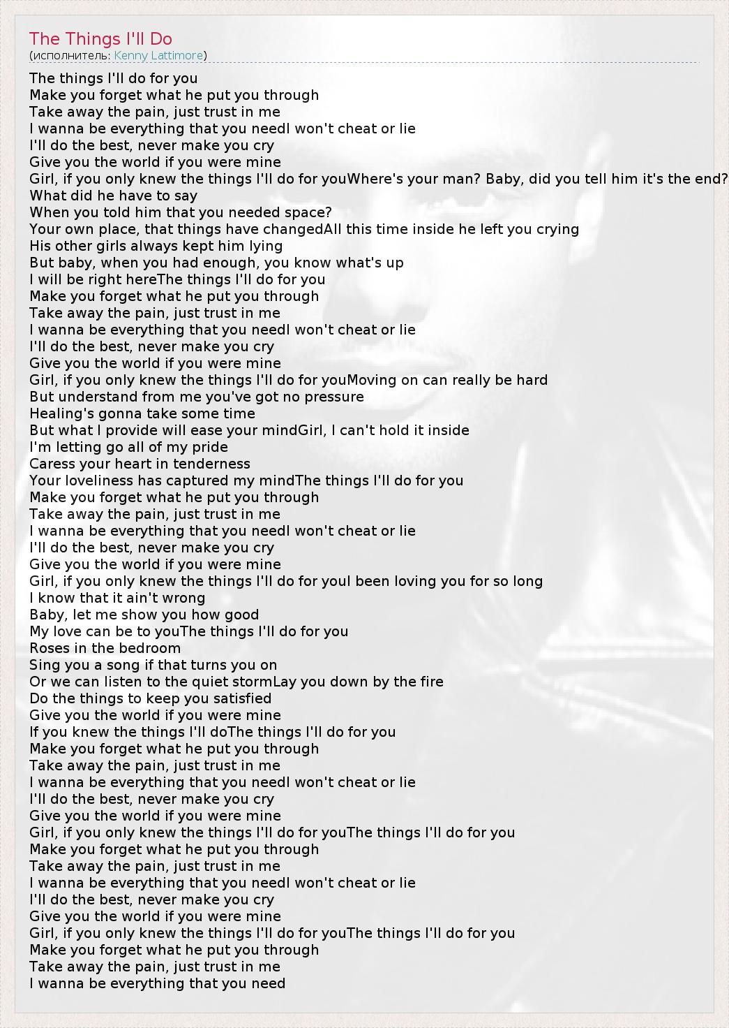 The things I'll do for you Make you forget what he put you through Take away the pain, just trust in me I wanna be everything that you needI won't cheat or lie I'll do the best, never make you cry Give you the world if you were mine Girl, if you only knew the things I'll do for youWhere's your man? Baby, did you tell him it's the end? What did he have to say When you told him that you needed space? Your own place, that things have changedAll this time inside he left you crying His other girls always kept him lying But baby, when you had enough, you know what's up I will be right hereThe things I'll do for you Make you forget what he put you through Take away the pain, just trust in me I wanna be everything that you needI won't cheat or lie I'll do the best, never make you cry Give you the world if you were mine Girl, if you only knew the things I'll do for youMoving on can really be hard But understand from me you've got no pressure Healing's gonna take some time But what I provide will ease your mindGirl, I can't hold it inside I'm letting go all of my pride Caress your heart in tenderness Your loveliness has captured my mindThe things I'll do for you Make you forget what he put you through Take away the pain, just trust in me I wanna be everything that you needI won't cheat or lie I'll do the best, never make you cry Give you the world if you were mine Girl, if you only knew the things I'll do for youI been loving you for so long I know that it ain't wrong Baby, let me show you how good My love can be to youThe things I'll do for you Roses in the bedroom Sing you a song if that turns you on Or we can listen to the quiet stormLay you down by the fire Do the things to keep you satisfied Give you the world if you were mine If you knew the things I'll doThe things I'll do for you Make you forget what he put you through Take away the pain, just trust in me I wanna be everything that you needI won't cheat or lie I'll do the best, never make you cry Give you the world if you were mine Girl, if you only knew the things I'll do for youThe things I'll do for you Make you forget what he put you through Take away the pain, just trust in me I wanna be everything that you needI won't cheat or lie I'll do the best, never make you cry Give you the world if you were mine Girl, if you only knew the things I'll do for youThe things I'll do for you Make you forget what he put you through Take away the pain, just trust in me I wanna be everything that you need