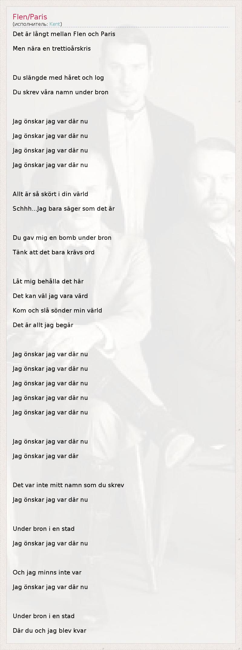 Det är långt mellan Flen och Paris Men nära en trettioårskris Du slängde med håret och log Du skrev våra namn under bron Jag önskar jag var där nu Jag önskar jag var där nu Jag önskar jag var där nu Jag önskar jag var där nu Allt är så skört i din värld Schhh...Jag bara säger som det är Du gav mig en bomb under bron Tänk att det bara krävs ord Låt mig behålla det här Det kan väl jag vara värd Kom och slå sönder min värld Det är allt jag begär Jag önskar jag var där nu Jag önskar jag var där nu Jag önskar jag var där nu Jag önskar jag var där nu Jag önskar jag var där nu Jag önskar jag var där nu Jag önskar jag var där Det var inte mitt namn som du skrev Jag önskar jag var där nu Under bron i en stad Jag önskar jag var där nu Och jag minns inte var Jag önskar jag var där nu Under bron i en stad Där du och jag blev kvar