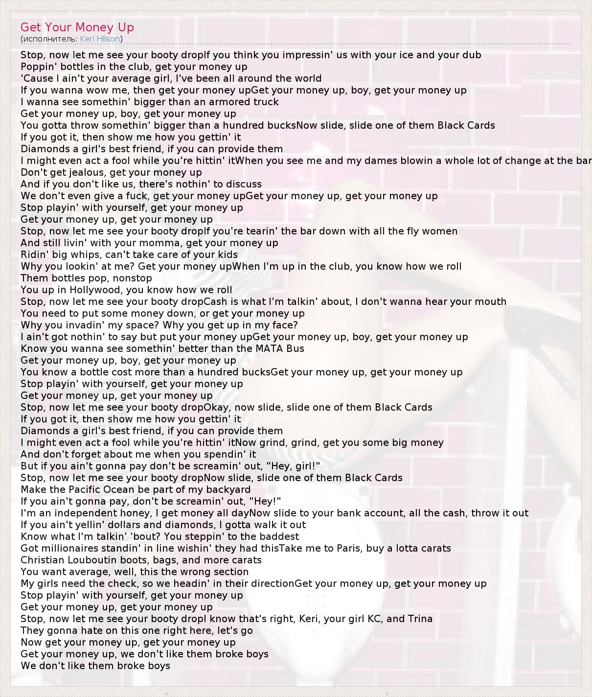 А как ты думаешь, о чем песня "Get Your Money Up" ?