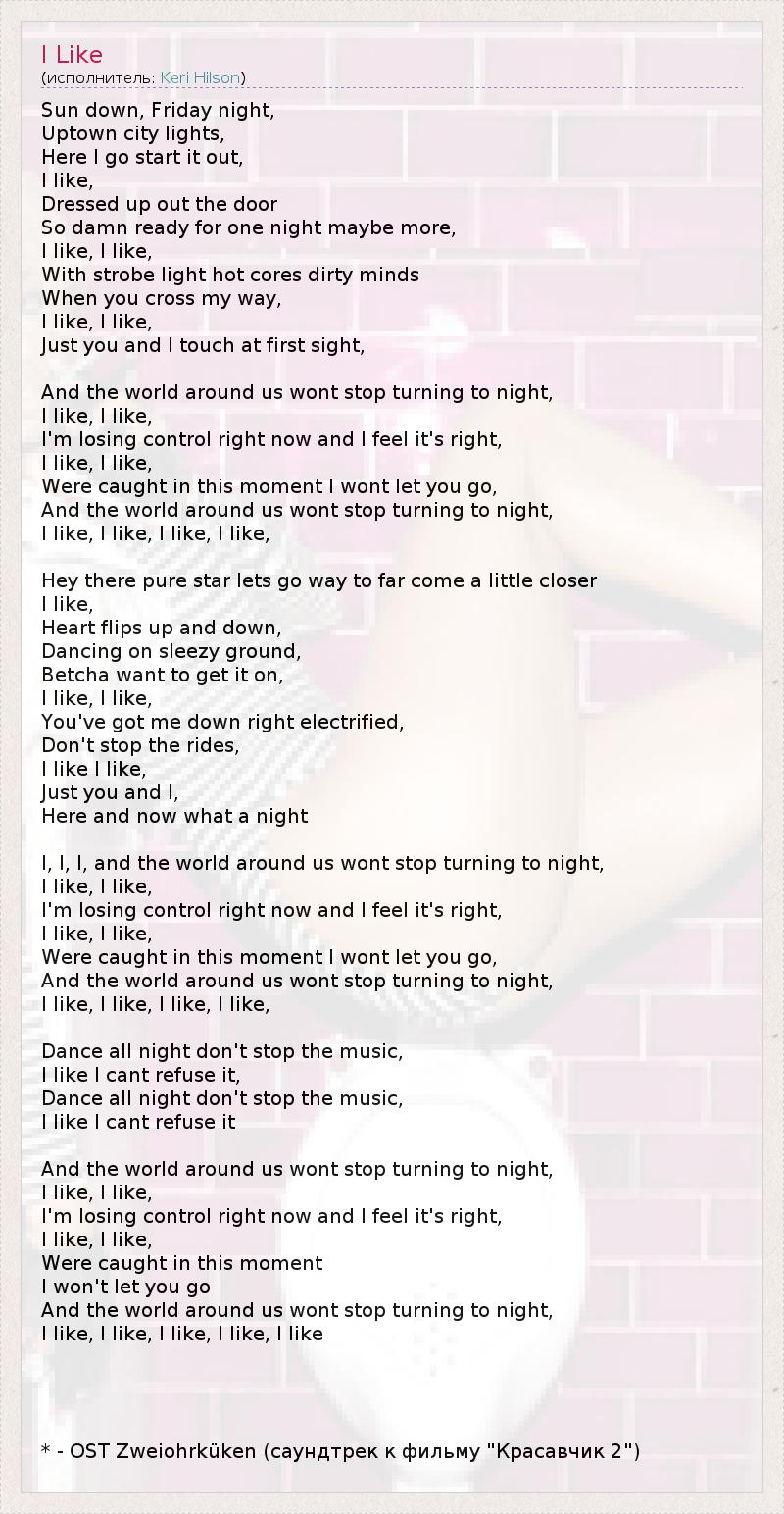Sun down, Friday night, Uptown city lights, Here I go start it out, I like, Dressed up out the door So damn ready for one night maybe more, I like, I like, With strobe light hot cores dirty minds When you cross my way, I like, I like, Just you and I touch at first sight, And the world around us wont stop turning to night, I like, I like, I'm losing control right now and I feel it's right, I like, I like, Were caught in this moment I wont let you go, And the world around us wont stop turning to night, I like, I like, I like, I like, Hey there pure star lets go way to far come a little closer I like, Heart flips up and down, Dancing on sleezy ground, Betcha want to get it on, I like, I like, You've got me down right electrified, Don't stop the rides, I like I like, Just you and I, Here and now what a night I, I, I, and the world around us wont stop turning to night, I like, I like, I'm losing control right now and I feel it's right, I like, I like, Were caught in this moment I wont let you go, And the world around us wont stop turning to night, I like, I like, I like, I like, Dance all night don't stop the music, I like I cant refuse it, Dance all night don't stop the music, I like I cant refuse it And the world around us wont stop turning to night, I like, I like, I'm losing control right now and I feel it's right, I like, I like, Were caught in this moment I won't let you go And the world around us wont stop turning to night, I like, I like, I like, I like, I like * - OST Zweiohrküken (саундтрек к фильму "Красавчик 2")