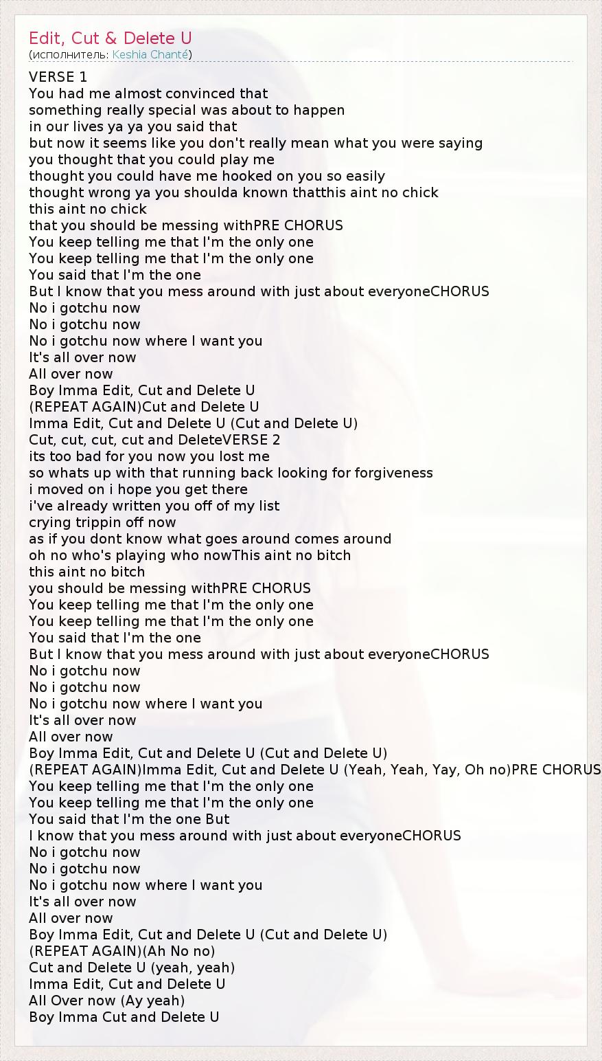 VERSE 1 You had me almost convinced that something really special was about to happen in our lives ya ya you said that but now it seems like you don't really mean what you were saying you thought that you could play me thought you could have me hooked on you so easily thought wrong ya you shoulda known thatthis aint no chick this aint no chick that you should be messing withPRE CHORUS You keep telling me that I'm the only one You keep telling me that I'm the only one You said that I'm the one But I know that you mess around with just about everyoneCHORUS No i gotchu now No i gotchu now No i gotchu now where I want you It's all over now All over now Boy Imma Edit, Cut and Delete U (REPEAT AGAIN)Cut and Delete U Imma Edit, Cut and Delete U (Cut and Delete U) Cut, cut, cut, cut and DeleteVERSE 2 its too bad for you now you lost me so whats up with that running back looking for forgiveness i moved on i hope you get there i've already written you off of my list crying trippin off now as if you dont know what goes around comes around oh no who's playing who nowThis aint no bitch this aint no bitch you should be messing withPRE CHORUS You keep telling me that I'm the only one You keep telling me that I'm the only one You said that I'm the one But I know that you mess around with just about everyoneCHORUS No i gotchu now No i gotchu now No i gotchu now where I want you It's all over now All over now Boy Imma Edit, Cut and Delete U (Cut and Delete U) (REPEAT AGAIN)Imma Edit, Cut and Delete U (Yeah, Yeah, Yay, Oh no)PRE CHORUS You keep telling me that I'm the only one You keep telling me that I'm the only one You said that I'm the one But I know that you mess around with just about everyoneCHORUS No i gotchu now No i gotchu now No i gotchu now where I want you It's all over now All over now Boy Imma Edit, Cut and Delete U (Cut and Delete U) (REPEAT AGAIN)(Ah No no) Cut and Delete U (yeah, yeah) Imma Edit, Cut and Delete U All Over now (Ay yeah) Boy Imma Cut and Delete U
