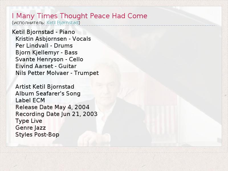 Ketil Bjornstad - Piano Kristin Asbjornsen - Vocals Per Lindvall - Drums Bjorn Kjellemyr - Bass Svante Henryson - Cello Eivind Aarset - Guitar Nils Petter Molvaer - Trumpet Artist Ketil Bjornstad Album Seafarer's Song Label ECM Release Date May 4, 2004 Recording Date Jun 21, 2003 Type Live Genre Jazz Styles Post-Bop