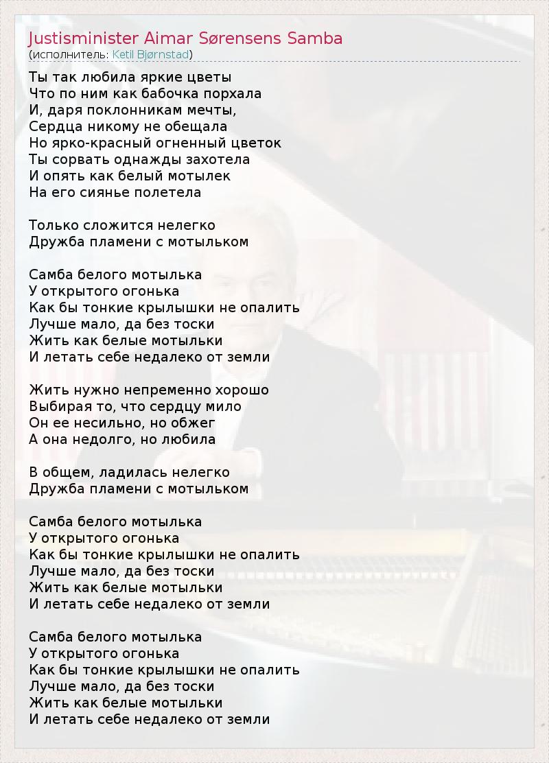 Ты так любила яркие цветы Что по ним как бабочка порхала И, даря поклонникам мечты, Сердца никому не обещала Но ярко-красный огненный цветок Ты сорвать однажды захотела И опять как белый мотылек На его сиянье полетела Только сложится нелегко Дружба пламени с мотыльком Самба белого мотылька У открытого огонька Как бы тонкие крылышки не опалить Лучше мало, да без тоски Жить как белые мотыльки И летать себе недалеко от земли Жить нужно непременно хорошо Выбирая то, что сердцу мило Он ее несильно, но обжег А она недолго, но любила В общем, ладилась нелегко Дружба пламени с мотыльком Самба белого мотылька У открытого огонька Как бы тонкие крылышки не опалить Лучше мало, да без тоски Жить как белые мотыльки И летать себе недалеко от земли Самба белого мотылька У открытого огонька Как бы тонкие крылышки не опалить Лучше мало, да без тоски Жить как белые мотыльки И летать себе недалеко от земли