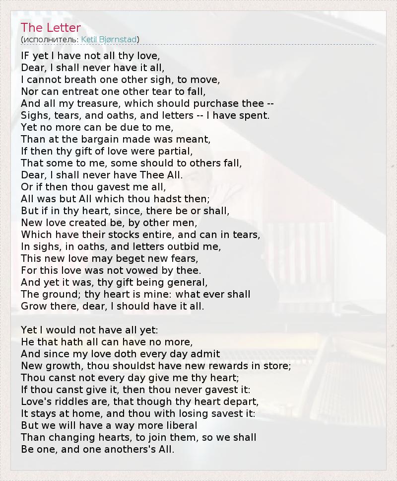 IF yet I have not all thy love, Dear, I shall never have it all, I cannot breath one other sigh, to move, Nor can entreat one other tear to fall, And all my treasure, which should purchase thee -- Sighs, tears, and oaths, and letters -- I have spent. Yet no more can be due to me, Than at the bargain made was meant, If then thy gift of love were partial, That some to me, some should to others fall, Dear, I shall never have Thee All. Or if then thou gavest me all, All was but All which thou hadst then; But if in thy heart, since, there be or shall, New love created be, by other men, Which have their stocks entire, and can in tears, In sighs, in oaths, and letters outbid me, This new love may beget new fears, For this love was not vowed by thee. And yet it was, thy gift being general, The ground; thy heart is mine: what ever shall Grow there, dear, I should have it all. Yet I would not have all yet: He that hath all can have no more, And since my love doth every day admit New growth, thou shouldst have new rewards in store; Thou canst not every day give me thy heart; If thou canst give it, then thou never gavest it: Love's riddles are, that though thy heart depart, It stays at home, and thou with losing savest it: But we will have a way more liberal Than changing hearts, to join them, so we shall Be one, and one anothers's All.