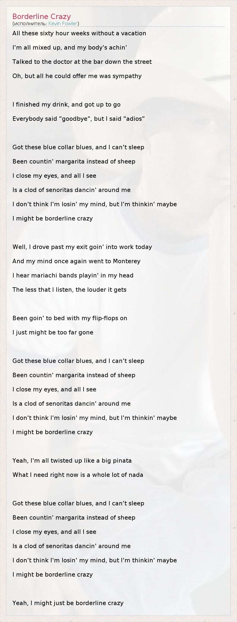 All these sixty hour weeks without a vacation I'm all mixed up, and my body's achin' Talked to the doctor at the bar down the street Oh, but all he could offer me was sympathy I finished my drink, and got up to go Everybody said "goodbye", but I said "adios" Got these blue collar blues, and I can't sleep Been countin' margarita instead of sheep I close my eyes, and all I see Is a clod of senoritas dancin' around me I don't think I'm losin' my mind, but I'm thinkin' maybe I might be borderline crazy Well, I drove past my exit goin' into work today And my mind once again went to Monterey I hear mariachi bands playin' in my head The less that I listen, the louder it gets Been goin' to bed with my flip-flops on I just might be too far gone Got these blue collar blues, and I can't sleep Been countin' margarita instead of sheep I close my eyes, and all I see Is a clod of senoritas dancin' around me I don't think I'm losin' my mind, but I'm thinkin' maybe I might be borderline crazy Yeah, I'm all twisted up like a big pinata What I need right now is a whole lot of nada Got these blue collar blues, and I can't sleep Been countin' margarita instead of sheep I close my eyes, and all I see Is a clod of senoritas dancin' around me I don't think I'm losin' my mind, but I'm thinkin' maybe I might be borderline crazy Yeah, I might just be borderline crazy