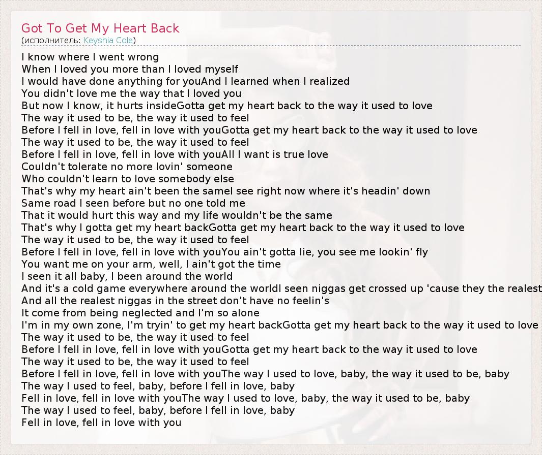 But now I know, it hurts insideGotta get my heart back to the way it used to love