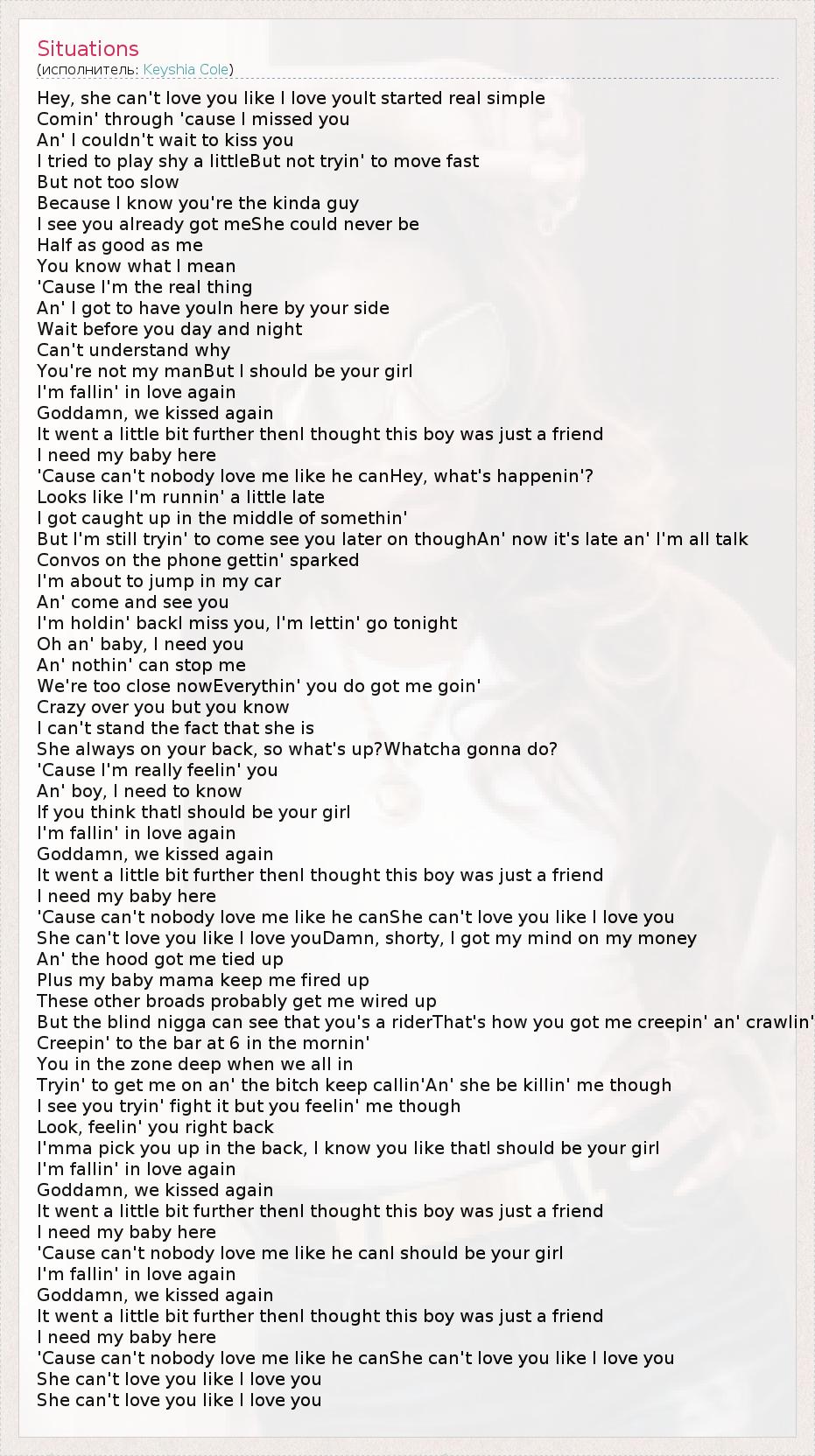 Hey, she can't love you like I love youIt started real simple Comin' through 'cause I missed you An' I couldn't wait to kiss you I tried to play shy a littleBut not tryin' to move fast But not too slow Because I know you're the kinda guy I see you already got meShe could never be Half as good as me You know what I mean 'Cause I'm the real thing An' I got to have youIn here by your side Wait before you day and night Can't understand why You're not my manBut I should be your girl I'm fallin' in love again Goddamn, we kissed again It went a little bit further thenI thought this boy was just a friend I need my baby here 'Cause can't nobody love me like he canHey, what's happenin'? Looks like I'm runnin' a little late I got caught up in the middle of somethin' But I'm still tryin' to come see you later on thoughAn' now it's late an' I'm all talk Convos on the phone gettin' sparked I'm about to jump in my car An' come and see you I'm holdin' backI miss you, I'm lettin' go tonight Oh an' baby, I need you An' nothin' can stop me We're too close nowEverythin' you do got me goin' Crazy over you but you know I can't stand the fact that she is She always on your back, so what's up?Whatcha gonna do? 'Cause I'm really feelin' you An' boy, I need to know If you think thatI should be your girl I'm fallin' in love again Goddamn, we kissed again It went a little bit further thenI thought this boy was just a friend I need my baby here 'Cause can't nobody love me like he canShe can't love you like I love you She can't love you like I love youDamn, shorty, I got my mind on my money An' the hood got me tied up Plus my baby mama keep me fired up These other broads probably get me wired up But the blind nigga can see that you's a riderThat's how you got me creepin' an' crawlin' Creepin' to the bar at 6 in the mornin' You in the zone deep when we all in Tryin' to get me on an' the bitch keep callin'An' she be killin' me though I see you tryin' fight it but you feelin' me though Look, feelin' you right back I'mma pick you up in the back, I know you like thatI should be your girl I'm fallin' in love again Goddamn, we kissed again It went a little bit further thenI thought this boy was just a friend I need my baby here 'Cause can't nobody love me like he canI should be your girl I'm fallin' in love again Goddamn, we kissed again It went a little bit further thenI thought this boy was just a friend I need my baby here 'Cause can't nobody love me like he canShe can't love you like I love you She can't love you like I love you She can't love you like I love you