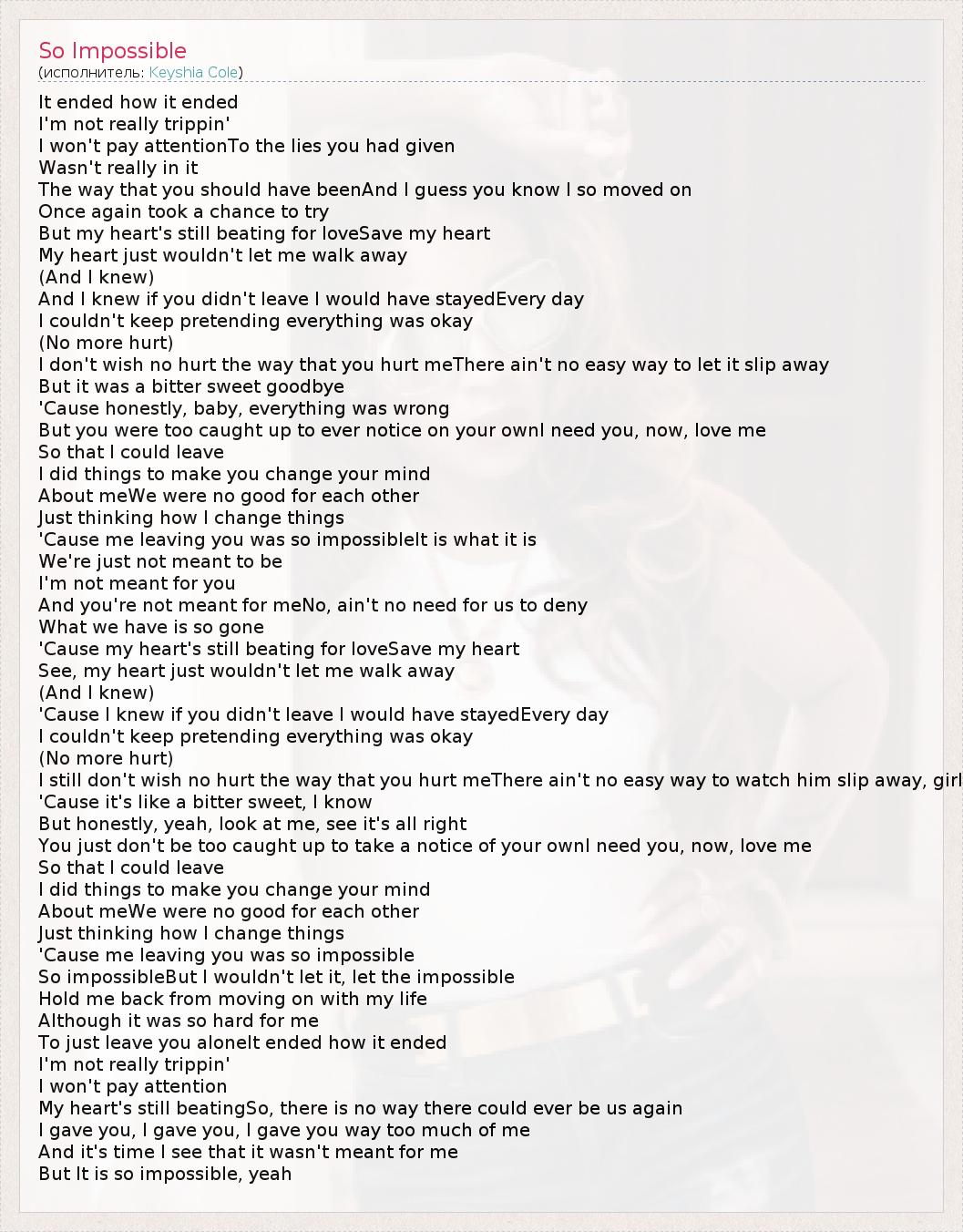 It ended how it ended I'm not really trippin' I won't pay attentionTo the lies you had given Wasn't really in it The way that you should have beenAnd I guess you know I so moved on Once again took a chance to try But my heart's still beating for loveSave my heart My heart just wouldn't let me walk away (And I knew) And I knew if you didn't leave I would have stayedEvery day I couldn't keep pretending everything was okay (No more hurt) I don't wish no hurt the way that you hurt meThere ain't no easy way to let it slip away But it was a bitter sweet goodbye 'Cause honestly, baby, everything was wrong But you were too caught up to ever notice on your ownI need you, now, love me So that I could leave I did things to make you change your mind About meWe were no good for each other Just thinking how I change things 'Cause me leaving you was so impossibleIt is what it is We're just not meant to be I'm not meant for you And you're not meant for meNo, ain't no need for us to deny What we have is so gone 'Cause my heart's still beating for loveSave my heart See, my heart just wouldn't let me walk away (And I knew) 'Cause I knew if you didn't leave I would have stayedEvery day I couldn't keep pretending everything was okay (No more hurt) I still don't wish no hurt the way that you hurt meThere ain't no easy way to watch him slip away, girl 'Cause it's like a bitter sweet, I know But honestly, yeah, look at me, see it's all right You just don't be too caught up to take a notice of your ownI need you, now, love me So that I could leave I did things to make you change your mind About meWe were no good for each other Just thinking how I change things 'Cause me leaving you was so impossible So impossibleBut I wouldn't let it, let the impossible Hold me back from moving on with my life Although it was so hard for me To just leave you aloneIt ended how it ended I'm not really trippin' I won't pay attention My heart's still beatingSo, there is no way there could ever be us again I gave you, I gave you, I gave you way too much of me And it's time I see that it wasn't meant for me But It is so impossible, yeah