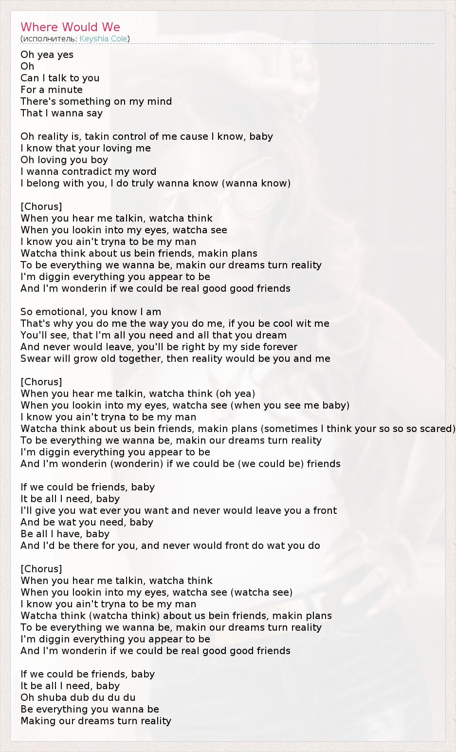 Oh yea yes Oh Can I talk to you For a minute There's something on my mind That I wanna say Oh reality is, takin control of me cause I know, baby I know that your loving me Oh loving you boy I wanna contradict my word I belong with you, I do truly wanna know (wanna know) [Chorus] When you hear me talkin, watcha think When you lookin into my eyes, watcha see I know you ain't tryna to be my man Watcha think about us bein friends, makin plans To be everything we wanna be, makin our dreams turn reality I'm diggin everything you appear to be And I'm wonderin if we could be real good good friends So emotional, you know I am That's why you do me the way you do me, if you be cool wit me You'll see, that I'm all you need and all that you dream And never would leave, you'll be right by my side forever Swear will grow old together, then reality would be you and me [Chorus] When you hear me talkin, watcha think (oh yea) When you lookin into my eyes, watcha see (when you see me baby) I know you ain't tryna to be my man Watcha think about us bein friends, makin plans (sometimes I think your so so so scared) To be everything we wanna be, makin our dreams turn reality I'm diggin everything you appear to be And I'm wonderin (wonderin) if we could be (we could be) friends If we could be friends, baby It be all I need, baby I'll give you wat ever you want and never would leave you a front And be wat you need, baby Be all I have, baby And I'd be there for you, and never would front do wat you do [Chorus] When you hear me talkin, watcha think When you lookin into my eyes, watcha see (watcha see) I know you ain't tryna to be my man Watcha think (watcha think) about us bein friends, makin plans To be everything we wanna be, makin our dreams turn reality I'm diggin everything you appear to be And I'm wonderin if we could be real good good friends If we could be friends, baby It be all I need, baby Oh shuba dub du du du Be everything you wanna be Making our dreams turn reality