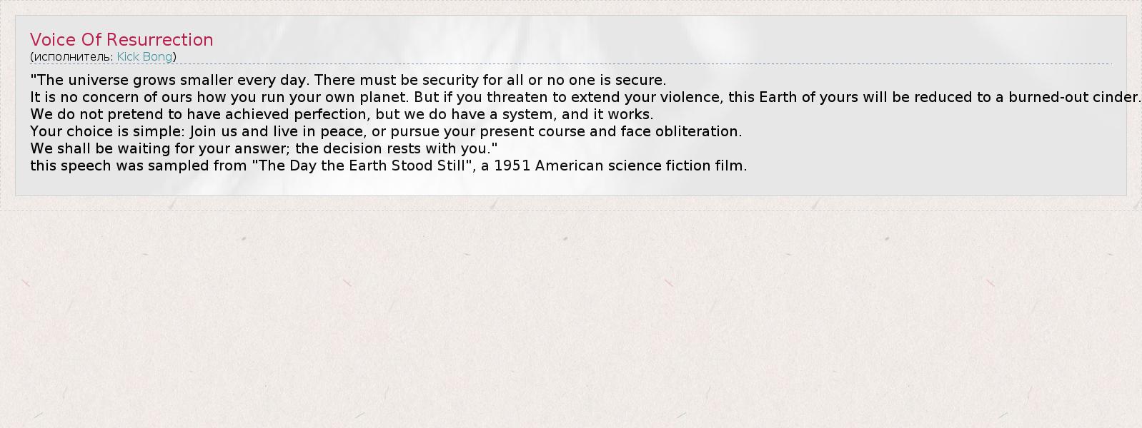 this speech was sampled from "The Day the Earth Stood Still", a 1951 American science fiction film.