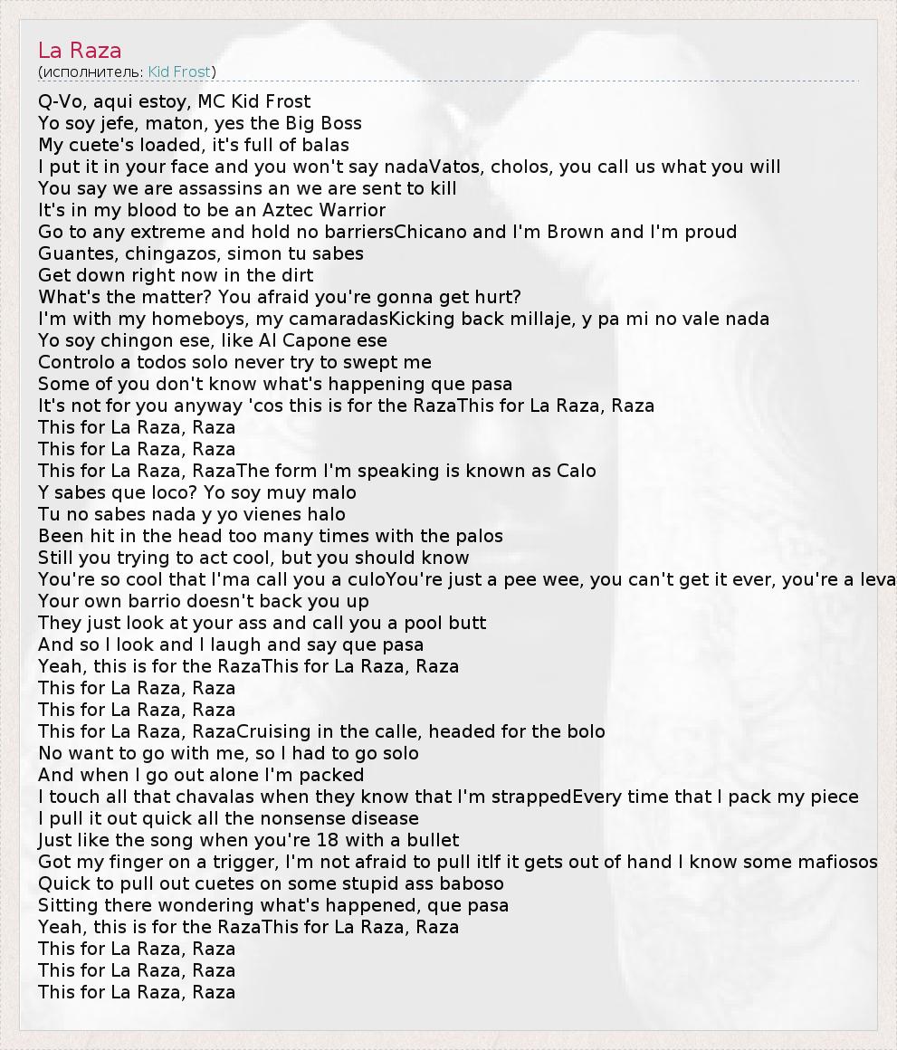 Q-Vo, aqui estoy, MC Kid Frost Yo soy jefe, maton, yes the Big Boss My cuete's loaded, it's full of balas I put it in your face and you won't say nadaVatos, cholos, you call us what you will You say we are assassins an we are sent to kill It's in my blood to be an Aztec Warrior Go to any extreme and hold no barriersChicano and I'm Brown and I'm proud Guantes, chingazos, simon tu sabes Get down right now in the dirt What's the matter? You afraid you're gonna get hurt? I'm with my homeboys, my camaradasKicking back millaje, y pa mi no vale nada Yo soy chingon ese, like Al Capone ese Controlo a todos solo never try to swept me Some of you don't know what's happening que pasa It's not for you anyway 'cos this is for the RazaThis for La Raza, Raza This for La Raza, Raza This for La Raza, Raza This for La Raza, RazaThe form I'm speaking is known as Calo Y sabes que loco? Yo soy muy malo Tu no sabes nada y yo vienes halo Been hit in the head too many times with the palos Still you trying to act cool, but you should know You're so cool that I'ma call you a culoYou're just a pee wee, you can't get it ever, you're a leva Your own barrio doesn't back you up They just look at your ass and call you a pool butt And so I look and I laugh and say que pasa Yeah, this is for the RazaThis for La Raza, Raza This for La Raza, Raza This for La Raza, Raza This for La Raza, RazaCruising in the calle, headed for the bolo No want to go with me, so I had to go solo And when I go out alone I'm packed I touch all that chavalas when they know that I'm strappedEvery time that I pack my piece I pull it out quick all the nonsense disease Just like the song when you're 18 with a bullet Got my finger on a trigger, I'm not afraid to pull itIf it gets out of hand I know some mafiosos Quick to pull out cuetes on some stupid ass baboso Sitting there wondering what's happened, que pasa Yeah, this is for the RazaThis for La Raza, Raza This for La Raza, Raza This for La Raza, Raza This for La Raza, Raza