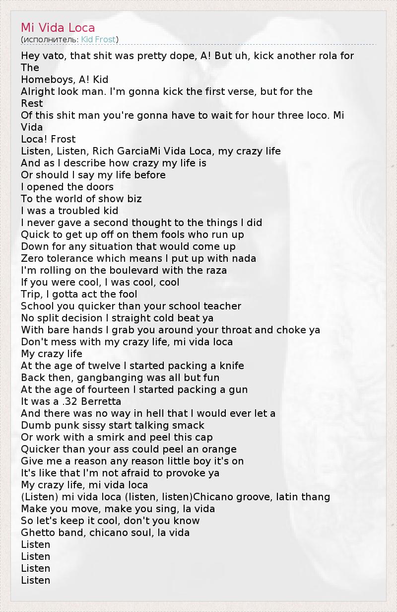 Hey vato, that shit was pretty dope, A! But uh, kick another rola for The Homeboys, A! Kid Alright look man. I'm gonna kick the first verse, but for the Rest Of this shit man you're gonna have to wait for hour three loco. Mi Vida Loca! Frost Listen, Listen, Rich GarciaMi Vida Loca, my crazy life And as I describe how crazy my life is Or should I say my life before I opened the doors To the world of show biz I was a troubled kid I never gave a second thought to the things I did Quick to get up off on them fools who run up Down for any situation that would come up Zero tolerance which means I put up with nada I'm rolling on the boulevard with the raza If you were cool, I was cool, cool Trip, I gotta act the fool School you quicker than your school teacher No split decision I straight cold beat ya With bare hands I grab you around your throat and choke ya Don't mess with my crazy life, mi vida loca My crazy life At the age of twelve I started packing a knife Back then, gangbanging was all but fun At the age of fourteen I started packing a gun It was a .32 Berretta And there was no way in hell that I would ever let a Dumb punk sissy start talking smack Or work with a smirk and peel this cap Quicker than your ass could peel an orange Give me a reason any reason little boy it's on It's like that I'm not afraid to provoke ya My crazy life, mi vida loca (Listen) mi vida loca (listen, listen)Chicano groove, latin thang Make you move, make you sing, la vida So let's keep it cool, don't you know Ghetto band, chicano soul, la vida Listen Listen Listen Listen