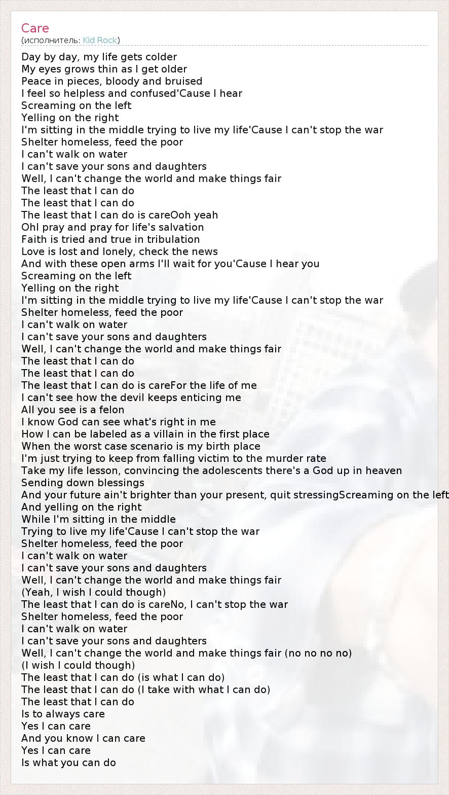 Day by day, my life gets colder My eyes grows thin as I get older Peace in pieces, bloody and bruised I feel so helpless and confused'Cause I hear Screaming on the left Yelling on the right I'm sitting in the middle trying to live my life'Cause I can't stop the war Shelter homeless, feed the poor I can't walk on water I can't save your sons and daughters Well, I can't change the world and make things fair The least that I can do The least that I can do The least that I can do is careOoh yeah OhI pray and pray for life's salvation Faith is tried and true in tribulation Love is lost and lonely, check the news And with these open arms I'll wait for you'Cause I hear you Screaming on the left Yelling on the right I'm sitting in the middle trying to live my life'Cause I can't stop the war Shelter homeless, feed the poor I can't walk on water I can't save your sons and daughters Well, I can't change the world and make things fair The least that I can do The least that I can do The least that I can do is careFor the life of me I can't see how the devil keeps enticing me All you see is a felon I know God can see what's right in me How I can be labeled as a villain in the first place When the worst case scenario is my birth place I'm just trying to keep from falling victim to the murder rate Take my life lesson, convincing the adolescents there's a God up in heaven Sending down blessings And your future ain't brighter than your present, quit stressingScreaming on the left And yelling on the right While I'm sitting in the middle Trying to live my life'Cause I can't stop the war Shelter homeless, feed the poor I can't walk on water I can't save your sons and daughters Well, I can't change the world and make things fair (Yeah, I wish I could though) The least that I can do is careNo, I can't stop the war Shelter homeless, feed the poor I can't walk on water I can't save your sons and daughters Well, I can't change the world and make things fair (no no no no) (I wish I could though) The least that I can do (is what I can do) The least that I can do (I take with what I can do) The least that I can do Is to always care Yes I can care And you know I can care Yes I can care Is what you can do