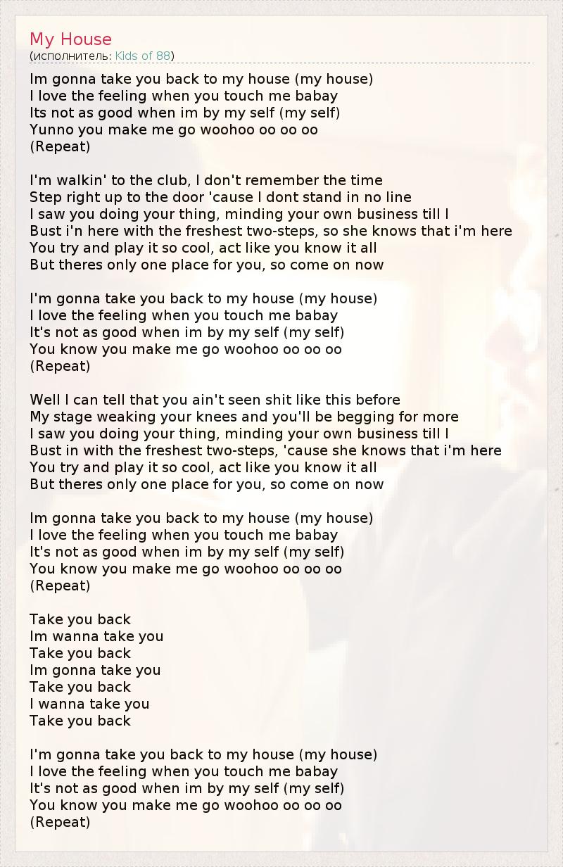 Im gonna take you back to my house (my house) I love the feeling when you touch me babay Its not as good when im by my self (my self) Yunno you make me go woohoo oo oo oo (Repeat) I'm walkin' to the club, I don't remember the time Step right up to the door 'cause I dont stand in no line I saw you doing your thing, minding your own business till I Bust i'n here with the freshest two-steps, so she knows that i'm here You try and play it so cool, act like you know it all But theres only one place for you, so come on now I'm gonna take you back to my house (my house) I love the feeling when you touch me babay It's not as good when im by my self (my self) You know you make me go woohoo oo oo oo (Repeat) Well I can tell that you ain't seen shit like this before My stage weaking your knees and you'll be begging for more I saw you doing your thing, minding your own business till I Bust in with the freshest two-steps, 'cause she knows that i'm here You try and play it so cool, act like you know it all But theres only one place for you, so come on now Im gonna take you back to my house (my house) I love the feeling when you touch me babay It's not as good when im by my self (my self) You know you make me go woohoo oo oo oo (Repeat) Take you back Im wanna take you Take you back Im gonna take you Take you back I wanna take you Take you back I'm gonna take you back to my house (my house) I love the feeling when you touch me babay It's not as good when im by my self (my self) You know you make me go woohoo oo oo oo (Repeat)