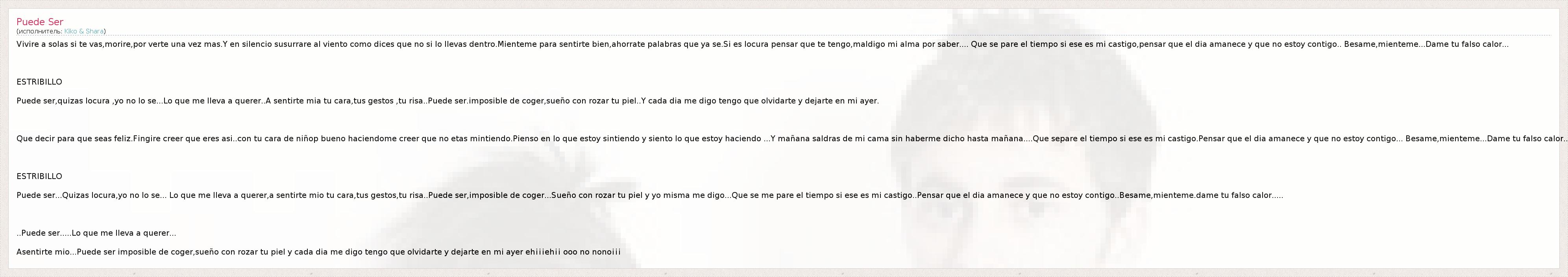 Puede ser...Quizas locura,yo no lo se... Lo que me lleva a querer,a sentirte mio tu cara,tus gestos,tu risa..Puede ser,imposible de coger...Sueño con rozar tu piel y yo misma me digo...Que se me pare el tiempo si ese es mi castigo..Pensar que el dia amanece y que no estoy contigo..Besame,mienteme.dame tu falso calor.....