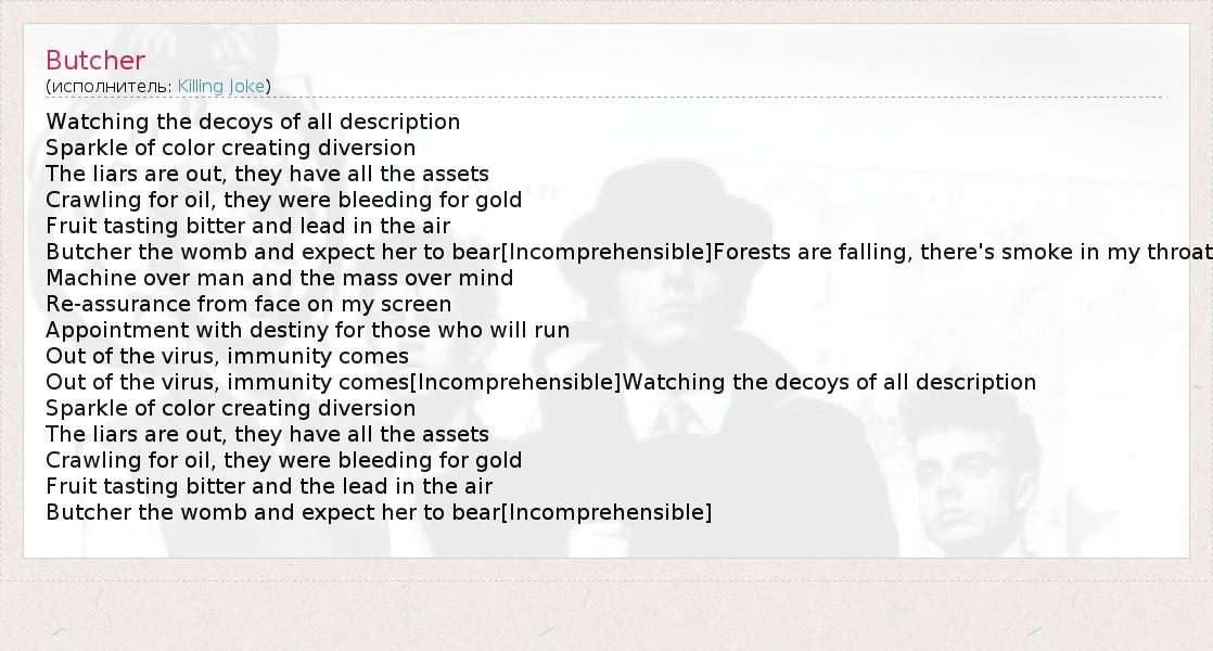 Watching the decoys of all description Sparkle of color creating diversion The liars are out, they have all the assets Crawling for oil, they were bleeding for gold Fruit tasting bitter and lead in the air Butcher the womb and expect her to bear[Incomprehensible]Forests are falling, there's smoke in my throat Machine over man and the mass over mind Re-assurance from face on my screen Appointment with destiny for those who will run Out of the virus, immunity comes Out of the virus, immunity comes[Incomprehensible]Watching the decoys of all description Sparkle of color creating diversion The liars are out, they have all the assets Crawling for oil, they were bleeding for gold Fruit tasting bitter and the lead in the air Butcher the womb and expect her to bear[Incomprehensible]