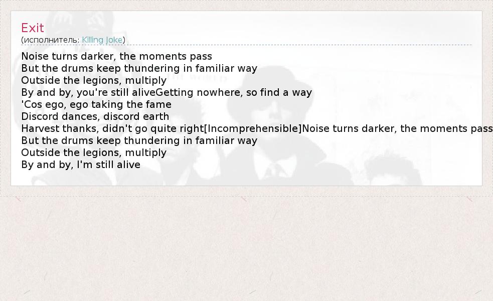Noise turns darker, the moments pass But the drums keep thundering in familiar way Outside the legions, multiply By and by, you're still aliveGetting nowhere, so find a way 'Cos ego, ego taking the fame Discord dances, discord earth Harvest thanks, didn't go quite right[Incomprehensible]Noise turns darker, the moments pass But the drums keep thundering in familiar way Outside the legions, multiply By and by, I'm still alive