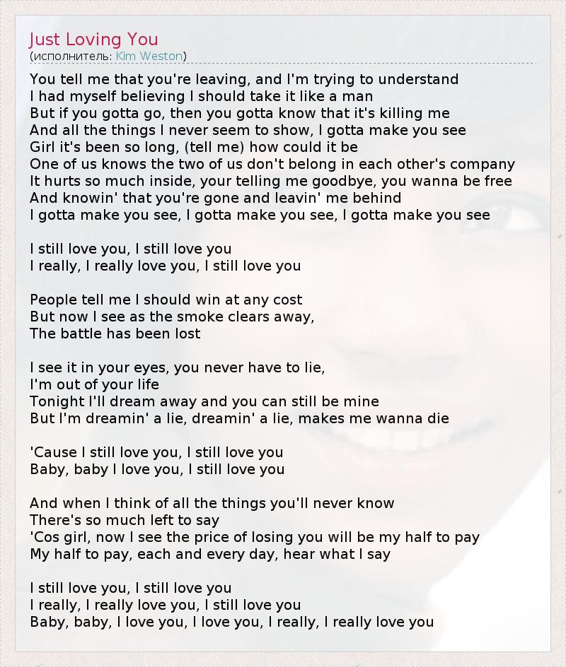 You tell me that you're leaving, and I'm trying to understand I had myself believing I should take it like a man But if you gotta go, then you gotta know that it's killing me And all the things I never seem to show, I gotta make you see Girl it's been so long, (tell me) how could it be One of us knows the two of us don't belong in each other's company It hurts so much inside, your telling me goodbye, you wanna be free And knowin' that you're gone and leavin' me behind I gotta make you see, I gotta make you see, I gotta make you see I still love you, I still love you I really, I really love you, I still love you People tell me I should win at any cost But now I see as the smoke clears away, The battle has been lost I see it in your eyes, you never have to lie, I'm out of your life Tonight I'll dream away and you can still be mine But I'm dreamin' a lie, dreamin' a lie, makes me wanna die 'Cause I still love you, I still love you Baby, baby I love you, I still love you And when I think of all the things you'll never know There's so much left to say 'Cos girl, now I see the price of losing you will be my half to pay My half to pay, each and every day, hear what I say I still love you, I still love you I really, I really love you, I still love you Baby, baby, I love you, I love you, I really, I really love you