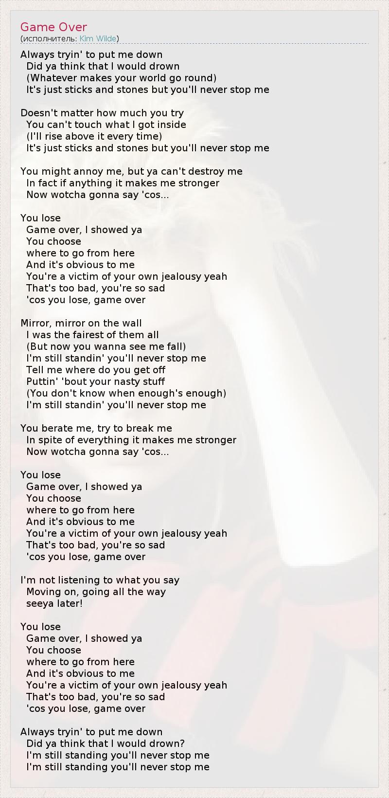 Always tryin' to put me down Did ya think that I would drown (Whatever makes your world go round) It's just sticks and stones but you'll never stop me Doesn't matter how much you try You can't touch what I got inside (I'll rise above it every time) It's just sticks and stones but you'll never stop me You might annoy me, but ya can't destroy me In fact if anything it makes me stronger Now wotcha gonna say 'cos... You lose Game over, I showed ya You choose where to go from here And it's obvious to me You're a victim of your own jealousy yeah That's too bad, you're so sad 'cos you lose, game over Mirror, mirror on the wall I was the fairest of them all (But now you wanna see me fall) I'm still standin' you'll never stop me Tell me where do you get off Puttin' 'bout your nasty stuff (You don't know when enough's enough) I'm still standin' you'll never stop me You berate me, try to break me In spite of everything it makes me stronger Now wotcha gonna say 'cos... You lose Game over, I showed ya You choose where to go from here And it's obvious to me You're a victim of your own jealousy yeah That's too bad, you're so sad 'cos you lose, game over I'm not listening to what you say Moving on, going all the way seeya later! You lose Game over, I showed ya You choose where to go from here And it's obvious to me You're a victim of your own jealousy yeah That's too bad, you're so sad 'cos you lose, game over Always tryin' to put me down Did ya think that I would drown? I'm still standing you'll never stop me I'm still standing you'll never stop me
