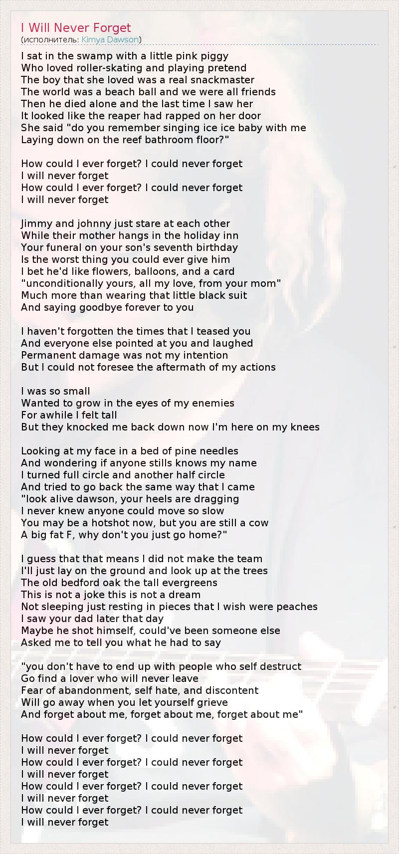 I sat in the swamp with a little pink piggy Who loved roller-skating and playing pretend The boy that she loved was a real snackmaster The world was a beach ball and we were all friends Then he died alone and the last time I saw her It looked like the reaper had rapped on her door She said "do you remember singing ice ice baby with me Laying down on the reef bathroom floor?" How could I ever forget? I could never forget I will never forget How could I ever forget? I could never forget I will never forget Jimmy and johnny just stare at each other While their mother hangs in the holiday inn Your funeral on your son's seventh birthday Is the worst thing you could ever give him I bet he'd like flowers, balloons, and a card "unconditionally yours, all my love, from your mom" Much more than wearing that little black suit And saying goodbye forever to you I haven't forgotten the times that I teased you And everyone else pointed at you and laughed Permanent damage was not my intention But I could not foresee the aftermath of my actions I was so small Wanted to grow in the eyes of my enemies For awhile I felt tall But they knocked me back down now I'm here on my knees Looking at my face in a bed of pine needles And wondering if anyone stills knows my name I turned full circle and another half circle And tried to go back the same way that I came "look alive dawson, your heels are dragging I never knew anyone could move so slow You may be a hotshot now, but you are still a cow A big fat F, why don't you just go home?" I guess that that means I did not make the team I'll just lay on the ground and look up at the trees The old bedford oak the tall evergreens This is not a joke this is not a dream Not sleeping just resting in pieces that I wish were peaches I saw your dad later that day Maybe he shot himself, could've been someone else Asked me to tell you what he had to say "you don't have to end up with people who self destruct Go find a lover who will never leave Fear of abandonment, self hate, and discontent Will go away when you let yourself grieve And forget about me, forget about me, forget about me" How could I ever forget? I could never forget I will never forget How could I ever forget? I could never forget I will never forget How could I ever forget? I could never forget I will never forget How could I ever forget? I could never forget I will never forget
