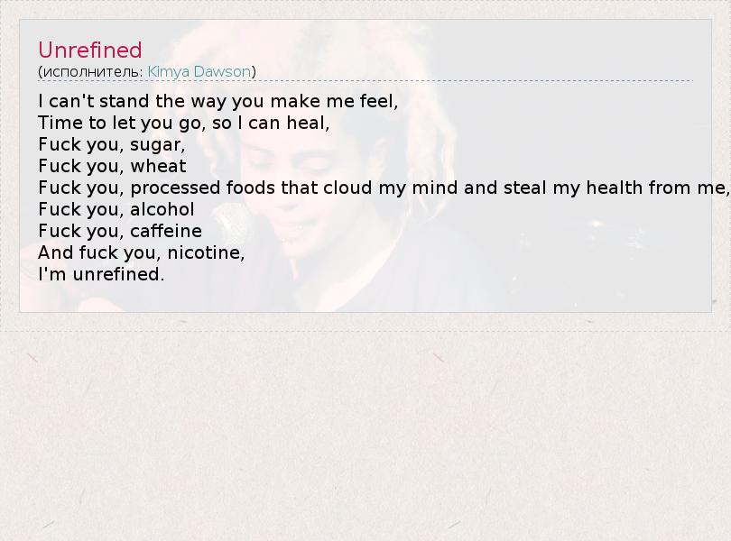 I can't stand the way you make me feel, Time to let you go, so I can heal, Fuck you, sugar, Fuck you, wheat Fuck you, processed foods that cloud my mind and steal my health from me, Fuck you, alcohol Fuck you, caffeine And fuck you, nicotine, I'm unrefined.