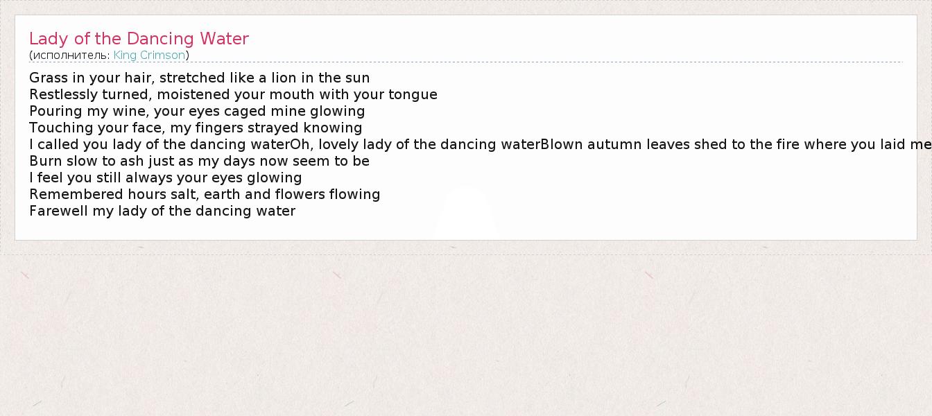 Grass in your hair, stretched like a lion in the sun Restlessly turned, moistened your mouth with your tongue Pouring my wine, your eyes caged mine glowing Touching your face, my fingers strayed knowing I called you lady of the dancing waterOh, lovely lady of the dancing waterBlown autumn leaves shed to the fire where you laid me Burn slow to ash just as my days now seem to be I feel you still always your eyes glowing Remembered hours salt, earth and flowers flowing Farewell my lady of the dancing water