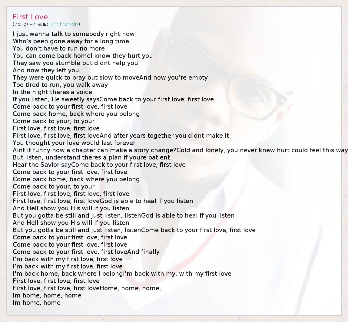 Это интересно:“У меня нет фанатов, у меня есть друзья. Когда вы смотрите на фэнов, как на друзей, тогда каждый объединяется для одной цели, которой является прославление”.Кирк Франклин для CNN Теплой ночью 1973-го года в дверь дома 64-хлетней Гертруды Франклин постучалась ее племянница, с которой был ребенок трехлетнего возраста. Девушка была взволнована и передала своей тете малыша, а затем... продолжение