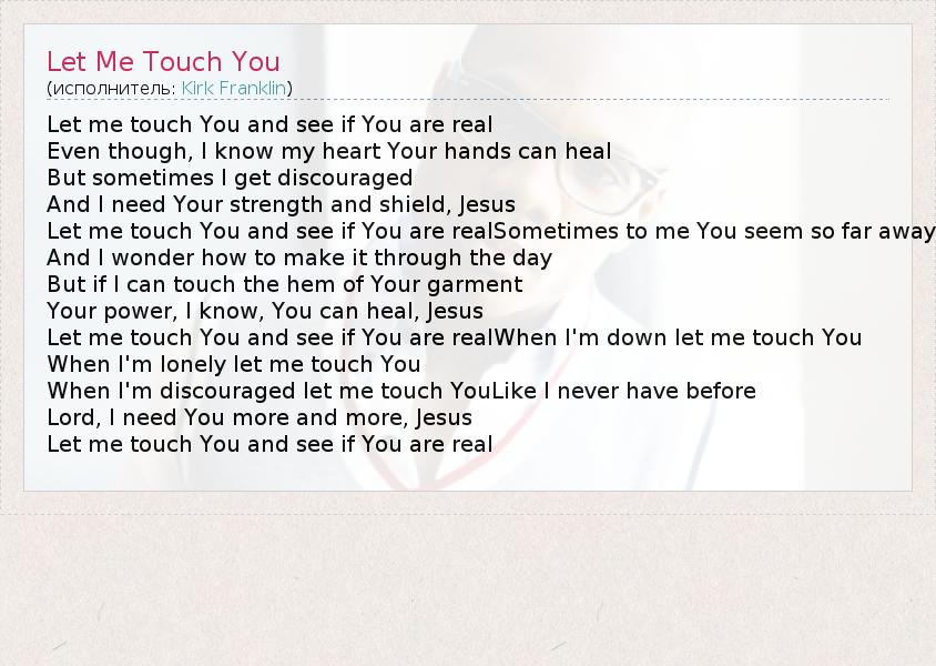 Let me touch You and see if You are real Even though, I know my heart Your hands can heal But sometimes I get discouraged And I need Your strength and shield, Jesus Let me touch You and see if You are realSometimes to me You seem so far away And I wonder how to make it through the day But if I can touch the hem of Your garment Your power, I know, You can heal, Jesus Let me touch You and see if You are realWhen I'm down let me touch You When I'm lonely let me touch You When I'm discouraged let me touch YouLike I never have before Lord, I need You more and more, Jesus Let me touch You and see if You are real