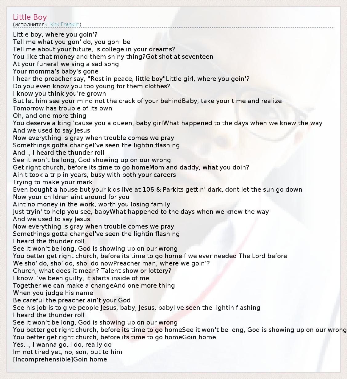 Это интересно:“У меня нет фанатов, у меня есть друзья. Когда вы смотрите на фэнов, как на друзей, тогда каждый объединяется для одной цели, которой является прославление”.Кирк Франклин для CNN Теплой ночью 1973-го года в дверь дома 64-хлетней Гертруды Франклин постучалась ее племянница, с которой был ребенок трехлетнего возраста. Девушка была взволнована и передала своей тете малыша, а затем... продолжение