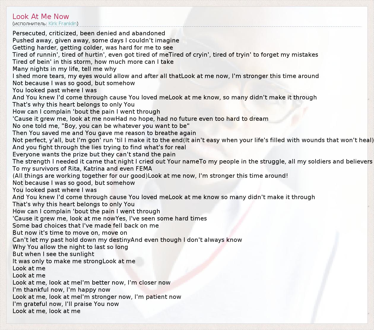 Persecuted, criticized, been denied and abandoned Pushed away, given away, some days I couldn't imagine Getting harder, getting colder, was hard for me to see Tired of runnin', tired of hurtin', even got tired of meTired of cryin', tired of tryin' to forget my mistakes Tired of bein' in this storm, how much more can I take Many nights in my life, tell me why I shed more tears, my eyes would allow and after all thatLook at me now, I'm stronger this time around Not because I was so good, but somehow You looked past where I was And You knew I'd come through cause You loved meLook at me know, so many didn't make it through That's why this heart belongs to only You How can I complain 'bout the pain I went through 'Cause it grew me, look at me nowHad no hope, had no future even too hard to dream No one told me, "Boy, you can be whatever you want to be" Then You saved me and You gave me reason to breathe again Not perfect, y'all, but I'm gon' run 'til I make it to the end(It ain't easy when your life's filled with wounds that won't heal) And you fight through the lies trying to find what's for real Everyone wants the prize but they can't stand the pain The strength I needed it came that night I cried out Your nameTo my people in the struggle, all my soldiers and believers To my survivors of Rita, Katrina and even FEMA (All things are working together for our good)Look at me now, I'm stronger this time around! Not because I was so good, but somehow You looked past where I was And You knew I'd come through cause You loved meLook at me know so many didn't make it through That's why this heart belongs to only You How can I complain 'bout the pain I went through 'Cause it grew me, look at me nowYes, I've seen some hard times Some bad choices that I've made fell back on me But now it's time to move on, move on Can't let my past hold down my destinyAnd even though I don't always know Why You allow the night to last so long But when I see the sunlight It was only to make me strongLook at me Look at me Look at me Look at me, look at meI'm better now, I'm closer now I'm thankful now, I'm happy now Look at me, look at meI'm stronger now, I'm patient now I'm grateful now, I'll praise You now Look at me, look at me