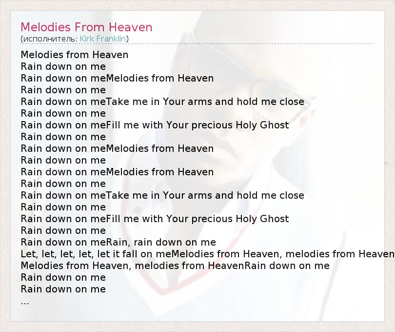 Melodies from Heaven Rain down on me Rain down on meMelodies from Heaven Rain down on me Rain down on meTake me in Your arms and hold me close Rain down on me Rain down on meFill me with Your precious Holy Ghost Rain down on me Rain down on meMelodies from Heaven Rain down on me Rain down on meMelodies from Heaven Rain down on me Rain down on meTake me in Your arms and hold me close Rain down on me Rain down on meFill me with Your precious Holy Ghost Rain down on me Rain down on meRain, rain down on me Let, let, let, let, let it fall on meMelodies from Heaven, melodies from Heaven Melodies from Heaven, melodies from HeavenRain down on me Rain down on me Rain down on me ...