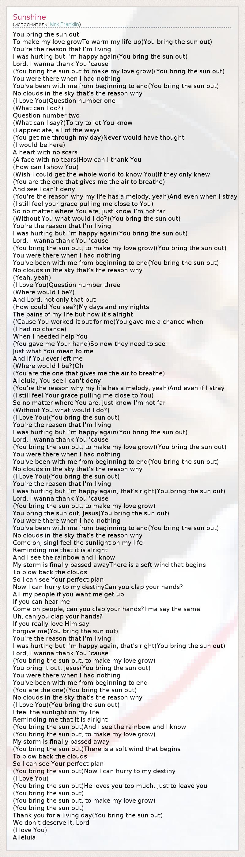 Это интересно:“У меня нет фанатов, у меня есть друзья. Когда вы смотрите на фэнов, как на друзей, тогда каждый объединяется для одной цели, которой является прославление”.Кирк Франклин для CNN Теплой ночью 1973-го года в дверь дома 64-хлетней Гертруды Франклин постучалась ее племянница, с которой был ребенок трехлетнего возраста. Девушка была взволнована и передала своей тете малыша, а затем... продолжение
