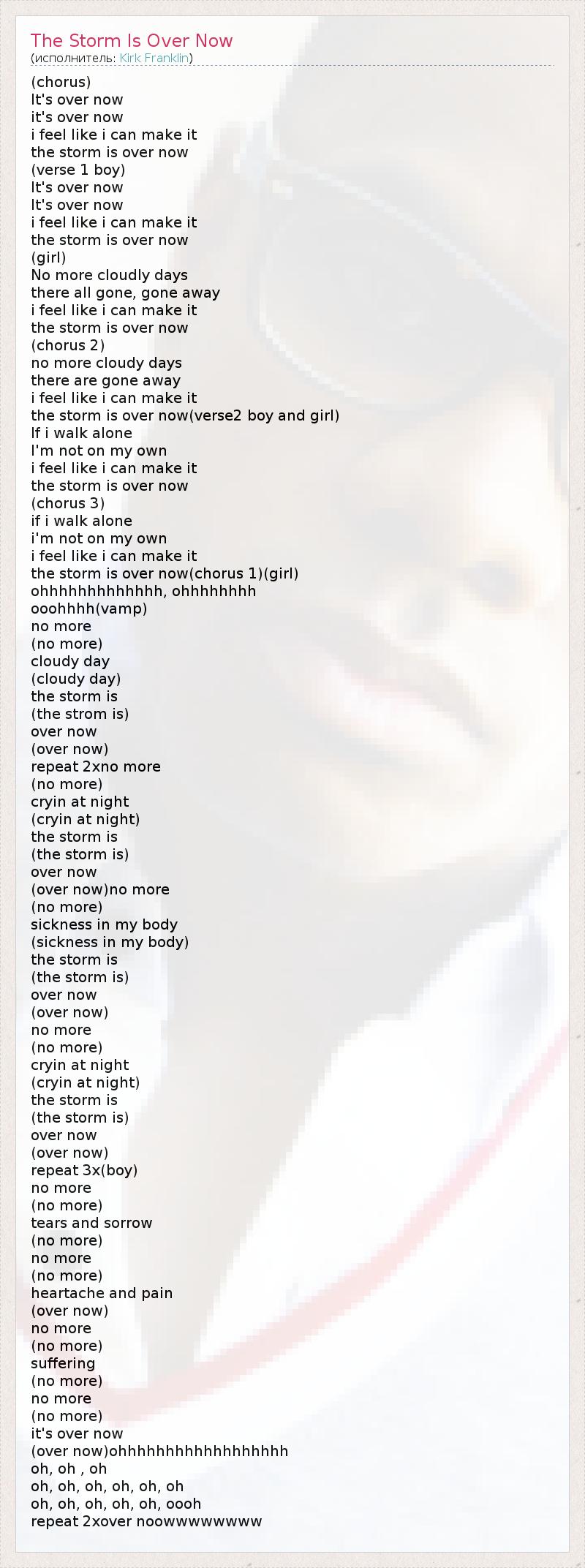 (chorus) It's over now it's over now i feel like i can make it the storm is over now (verse 1 boy) It's over now It's over now i feel like i can make it the storm is over now (girl) No more cloudly days there all gone, gone away i feel like i can make it the storm is over now (chorus 2) no more cloudy days there are gone away i feel like i can make it the storm is over now(verse2 boy and girl) If i walk alone I'm not on my own i feel like i can make it the storm is over now (chorus 3) if i walk alone i'm not on my own i feel like i can make it the storm is over now(chorus 1)(girl) ohhhhhhhhhhhhh, ohhhhhhhh ooohhhh(vamp) no more (no more) cloudy day (cloudy day) the storm is (the strom is) over now (over now) repeat 2xno more (no more) cryin at night (cryin at night) the storm is (the storm is) over now (over now)no more (no more) sickness in my body (sickness in my body) the storm is (the storm is) over now (over now) no more (no more) cryin at night (cryin at night) the storm is (the storm is) over now (over now) repeat 3x(boy) no more (no more) tears and sorrow (no more) no more (no more) heartache and pain (over now) no more (no more) suffering (no more) no more (no more) it's over now (over now)ohhhhhhhhhhhhhhhhhh oh, oh , oh oh, oh, oh, oh, oh, oh oh, oh, oh, oh, oh, oooh repeat 2xover noowwwwwwww
