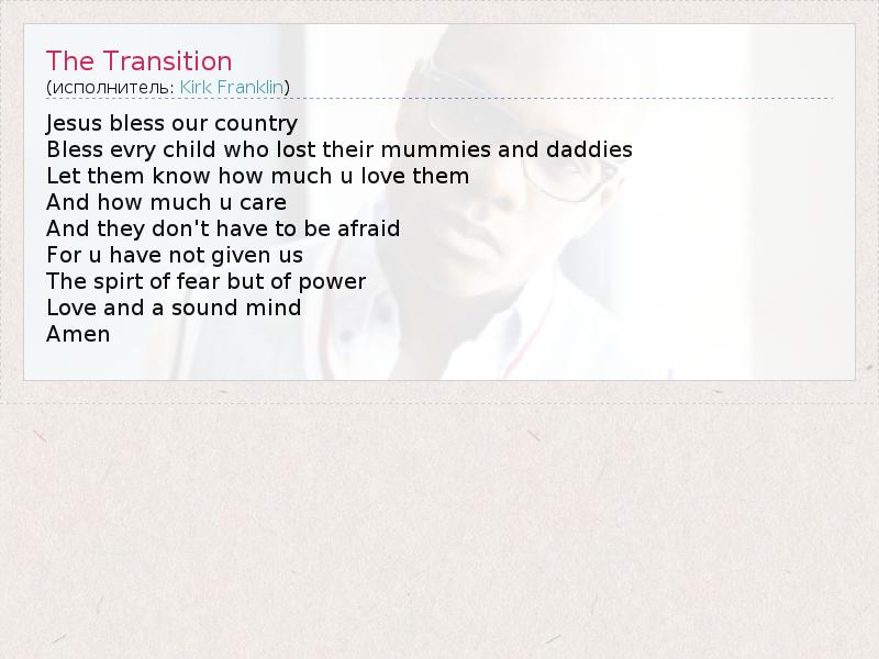 Это интересно:“У меня нет фанатов, у меня есть друзья. Когда вы смотрите на фэнов, как на друзей, тогда каждый объединяется для одной цели, которой является прославление”.Кирк Франклин для CNN Теплой ночью 1973-го года в дверь дома 64-хлетней Гертруды Франклин постучалась ее племянница, с которой был ребенок трехлетнего возраста. Девушка была взволнована и передала своей тете малыша, а затем... продолжение