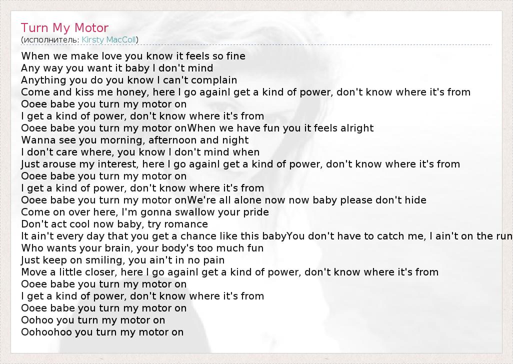 When we make love you know it feels so fine Any way you want it baby I don't mind Anything you do you know I can't complain Come and kiss me honey, here I go againI get a kind of power, don't know where it's from Ooee babe you turn my motor on I get a kind of power, don't know where it's from Ooee babe you turn my motor onWhen we have fun you it feels alright Wanna see you morning, afternoon and night I don't care where, you know I don't mind when Just arouse my interest, here I go againI get a kind of power, don't know where it's from Ooee babe you turn my motor on I get a kind of power, don't know where it's from Ooee babe you turn my motor onWe're all alone now now baby please don't hide Come on over here, I'm gonna swallow your pride Don't act cool now baby, try romance It ain't every day that you get a chance like this babyYou don't have to catch me, I ain't on the run Who wants your brain, your body's too much fun Just keep on smiling, you ain't in no pain Move a little closer, here I go againI get a kind of power, don't know where it's from Ooee babe you turn my motor on I get a kind of power, don't know where it's from Ooee babe you turn my motor on Oohoo you turn my motor on Oohoohoo you turn my motor on