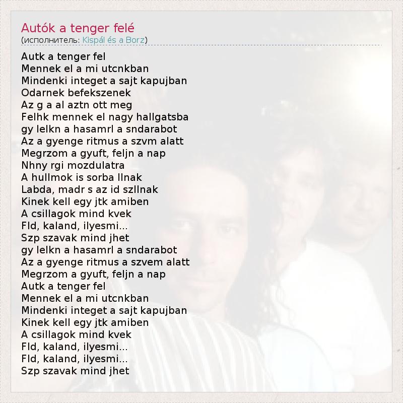 Autk a tenger fel Mennek el a mi utcnkban Mindenki integet a sajt kapujban Odarnek befekszenek Az g a al aztn ott meg Felhk mennek el nagy hallgatsba gy lelkn a hasamrl a sndarabot Az a gyenge ritmus a szvm alatt Megrzom a gyuft, feljn a nap Nhny rgi mozdulatra A hullmok is sorba llnak Labda, madr s az id szllnak Kinek kell egy jtk amiben A csillagok mind kvek Fld, kaland, ilyesmi... Szp szavak mind jhet gy lelkn a hasamrl a sndarabot Az a gyenge ritmus a szvem alatt Megrzom a gyuft, feljn a nap Autk a tenger fel Mennek el a mi utcnkban Mindenki integet a sajt kapujban Kinek kell egy jtk amiben A csillagok mind kvek Fld, kaland, ilyesmi... Fld, kaland, ilyesmi... Szp szavak mind jhet