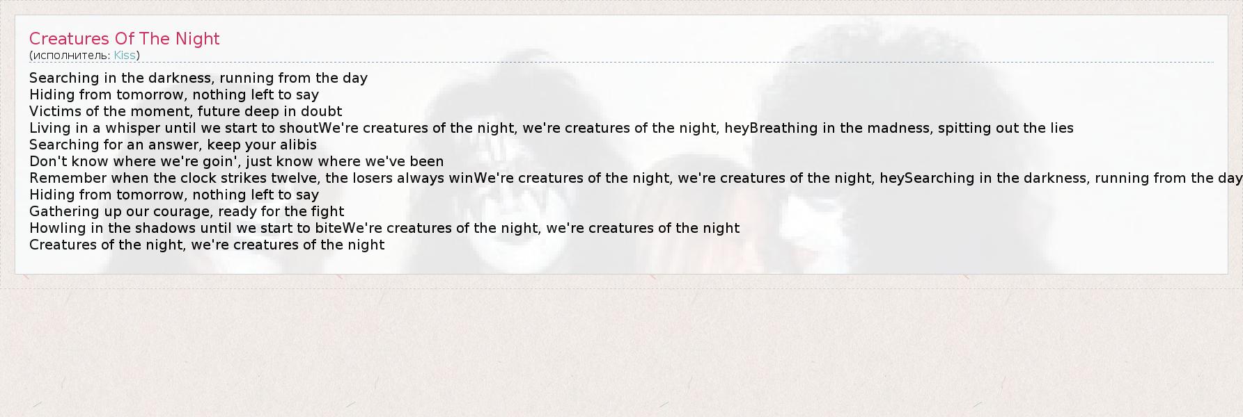 Searching in the darkness, running from the day Hiding from tomorrow, nothing left to say Victims of the moment, future deep in doubt Living in a whisper until we start to shoutWe're creatures of the night, we're creatures of the night, heyBreathing in the madness, spitting out the lies Searching for an answer, keep your alibis Don't know where we're goin', just know where we've been Remember when the clock strikes twelve, the losers always winWe're creatures of the night, we're creatures of the night, heySearching in the darkness, running from the day Hiding from tomorrow, nothing left to say Gathering up our courage, ready for the fight Howling in the shadows until we start to biteWe're creatures of the night, we're creatures of the night Creatures of the night, we're creatures of the night