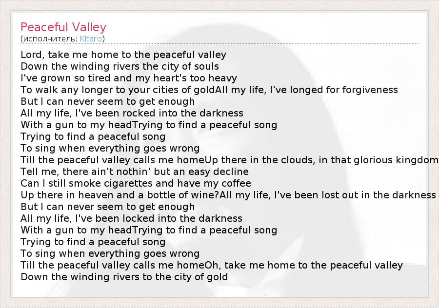 Till the peaceful valley calls me homeOh, take me home to the peaceful valley