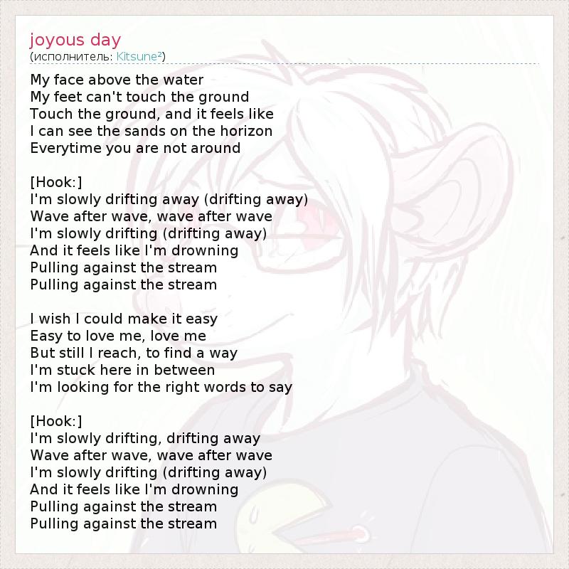 My face above the water My feet can't touch the ground Touch the ground, and it feels like I can see the sands on the horizon Everytime you are not around [Hook:] I'm slowly drifting away (drifting away) Wave after wave, wave after wave I'm slowly drifting (drifting away) And it feels like I'm drowning Pulling against the stream Pulling against the stream I wish I could make it easy Easy to love me, love me But still I reach, to find a way I'm stuck here in between I'm looking for the right words to say [Hook:] I'm slowly drifting, drifting away Wave after wave, wave after wave I'm slowly drifting (drifting away) And it feels like I'm drowning Pulling against the stream Pulling against the stream