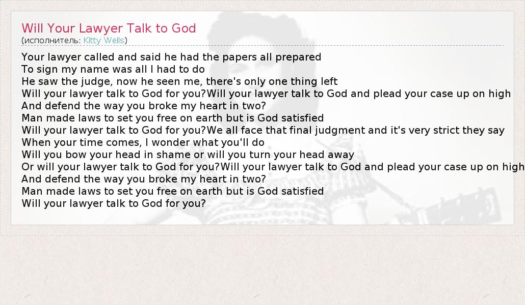 ГлавнаяИсполнителиKitty WellsWill Your Lawyer Talk to God